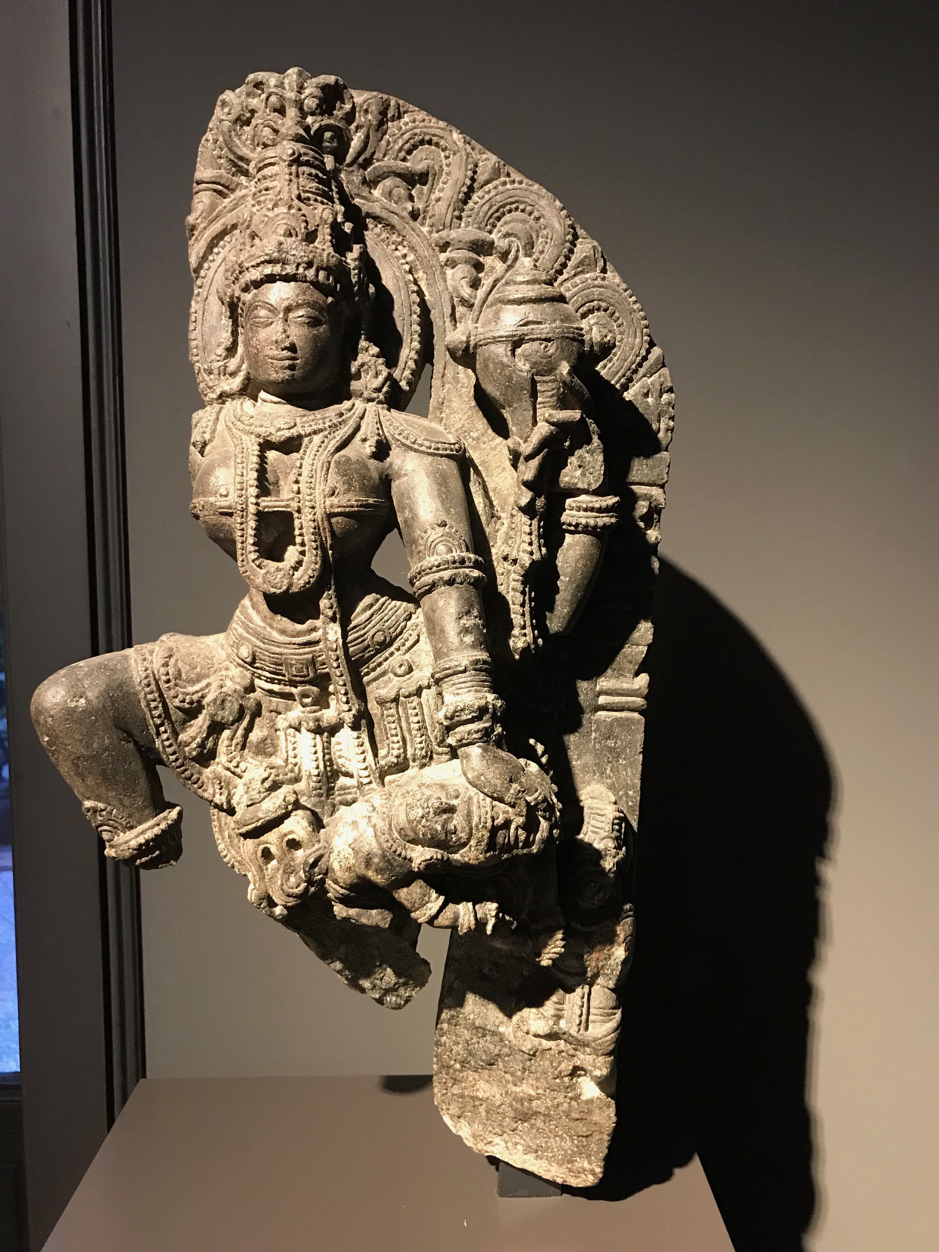 This statue depicts the Hindu goddess Durga fighting demons. It is made from stone and dates from the 11th century CE during the rule of the Hoyshala dynasty. It was likely made in the vicinity of Mysore, in Karnataka, India. (Museum Rietberg, Zürich)