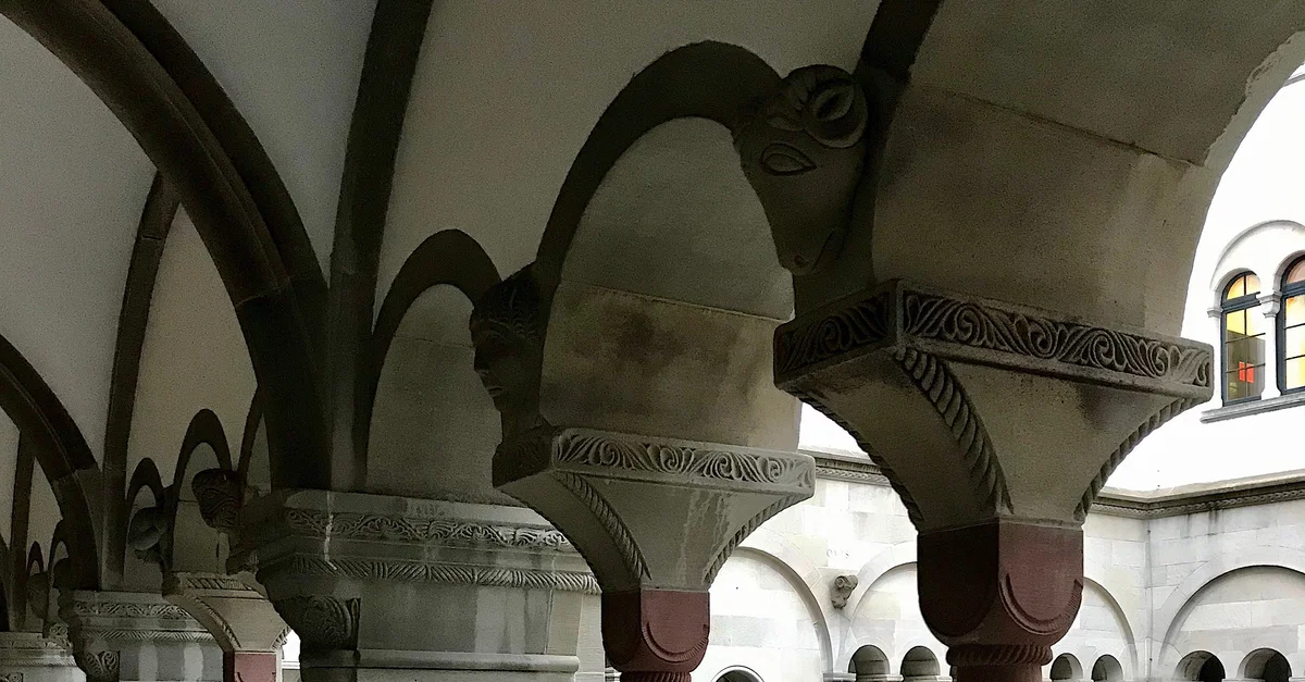 Grossmünster Cathedral in Zürich, Switzerland contains a nearby cloister that was refurbished and renovated in the 1960s. The original cloister dates from c. 1170 CE.