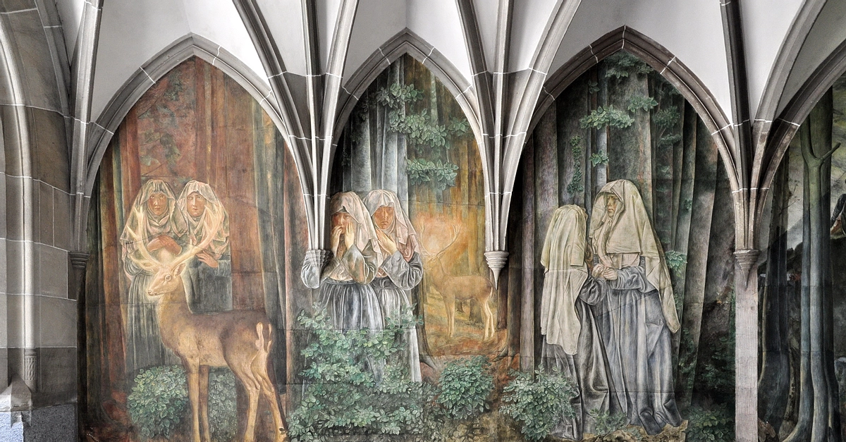 A fresco by the Swiss artist Paul Bodmer (1886-1983 CE) within the Fraumunster which illustrates the legend of its founding by Princesses Hildegard and Bertha in the mid-9th century CE.