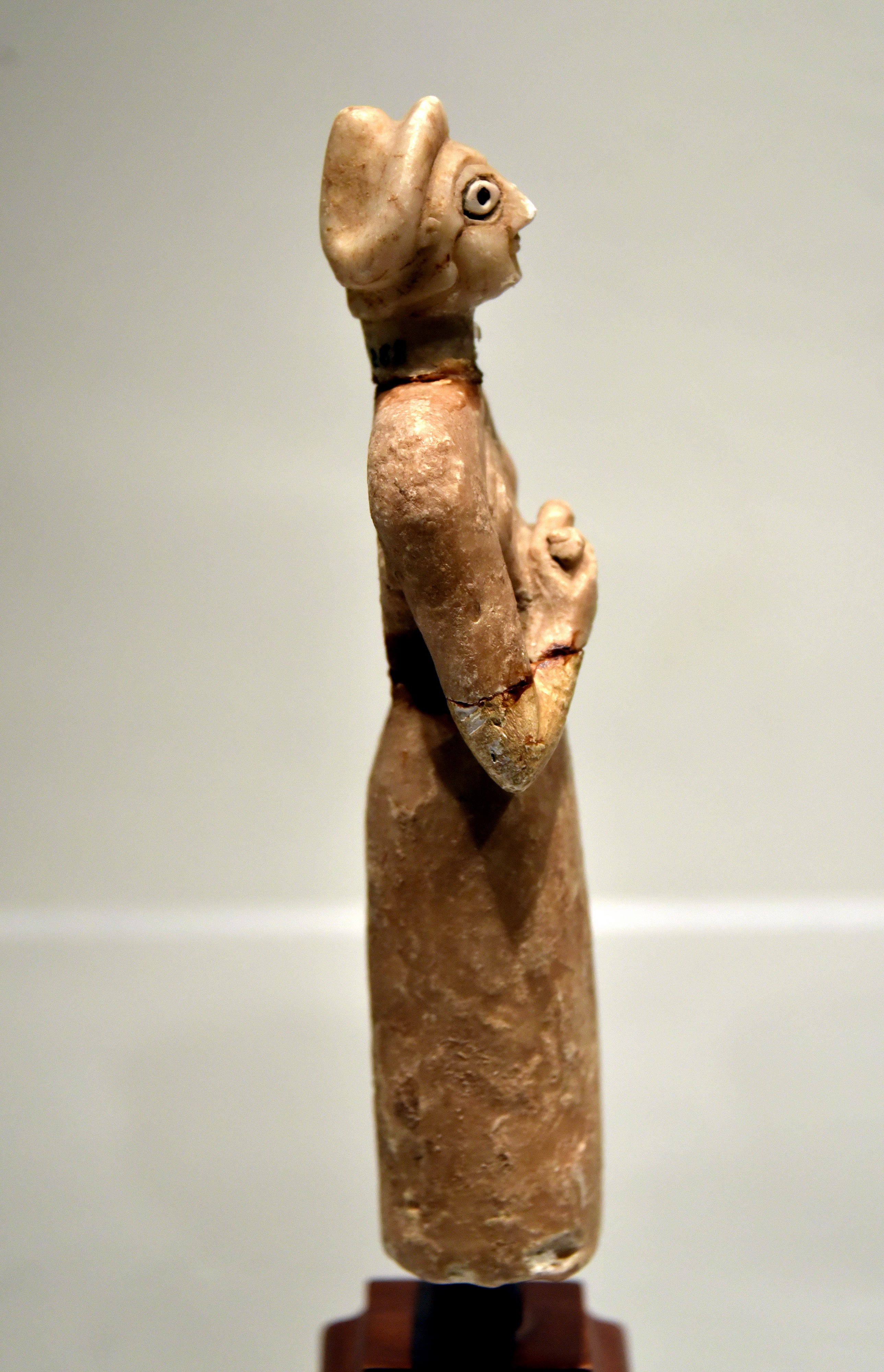 Limestone statue of a Sumerian female in a gesture of prayer. The eye sockets were filled in with white shell set in bitumen. She wears a Sumerian garment with a bare right shoulder. Her hair was carefully carved. Side view, right. From the Temple of Sin, Khafajah (also Khafaje; ancient Tutub), Dyala Governorate, Iraq; excavated by the Oriental Institute (Chicago), 4th season, 1933/1934 CE. Early Dynastic III, c. 2400 BCE. (The Sulaymaniyah Museum, Iraqi Kurdistan).