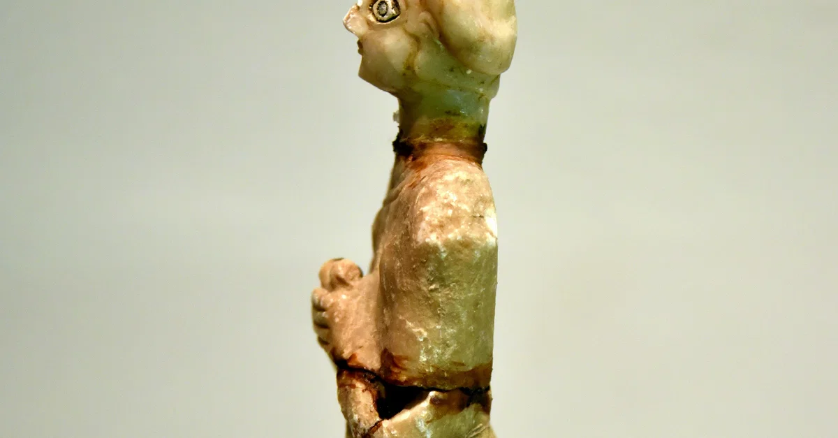 Limestone statue of a Sumerian female in a gesture of prayer. The eye sockets were filled in with white shell set in bitumen. She wears a Sumerian garment with a bare right shoulder. Her hair was carefully carved. Side view, left. From the Temple of Sin, Khafajah (also Khafaje; ancient Tutub), Dyala Governorate, Iraq; excavated by the Oriental Institute (Chicago), 4th season, 1933/1934 CE. Early Dynastic III, c. 2400 BCE. (The Sulaymaniyah Museum, Iraqi Kurdistan).