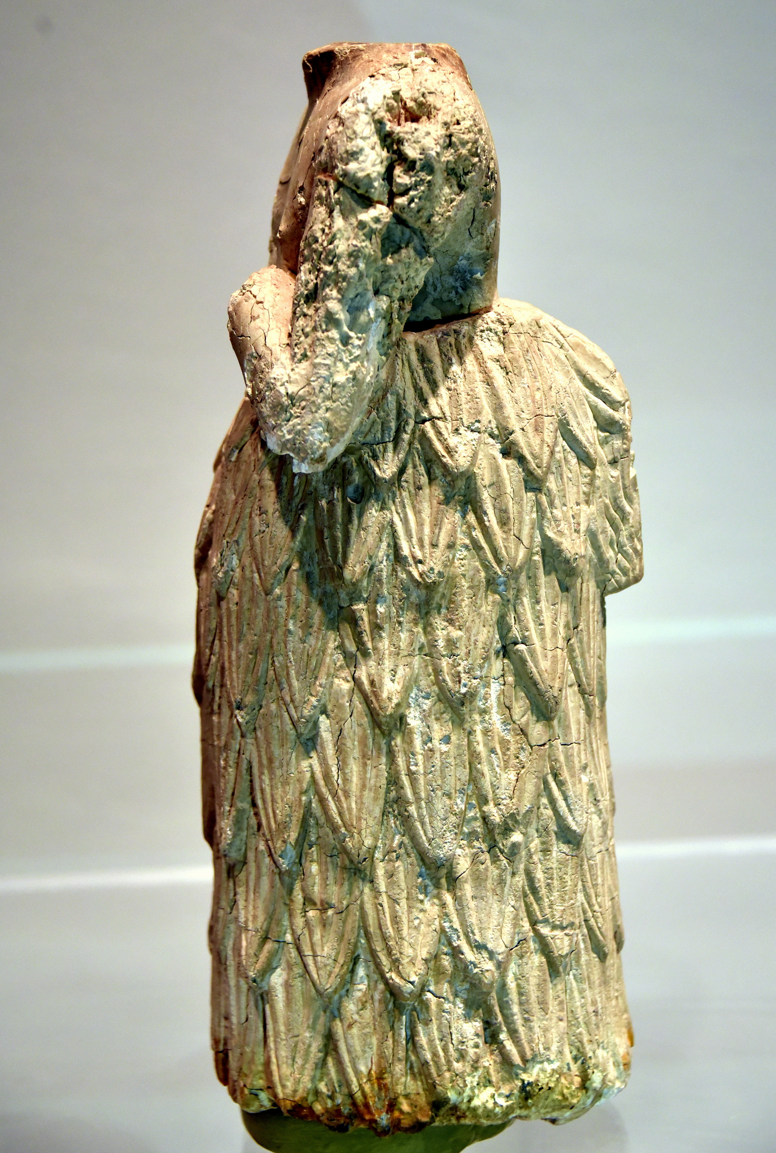 Limestone statue of a Sumerian male in a gesture of prayer. He wears the classical Sumerian flounced garment. The head/neck, right upper limb, and both feet are lost. Side view, left. From the Small Shrine at Khafajah (also Khafaje; ancient Tutub), Dyala Governorate, Iraq; excavated by the Oriental Institute (Chicago), 3rd season, 1932/1933 CE. Early Dynastic Period, 2900-2350 BCE. (The Sulaymaniyah Museum, Iraqi Kurdistan).
