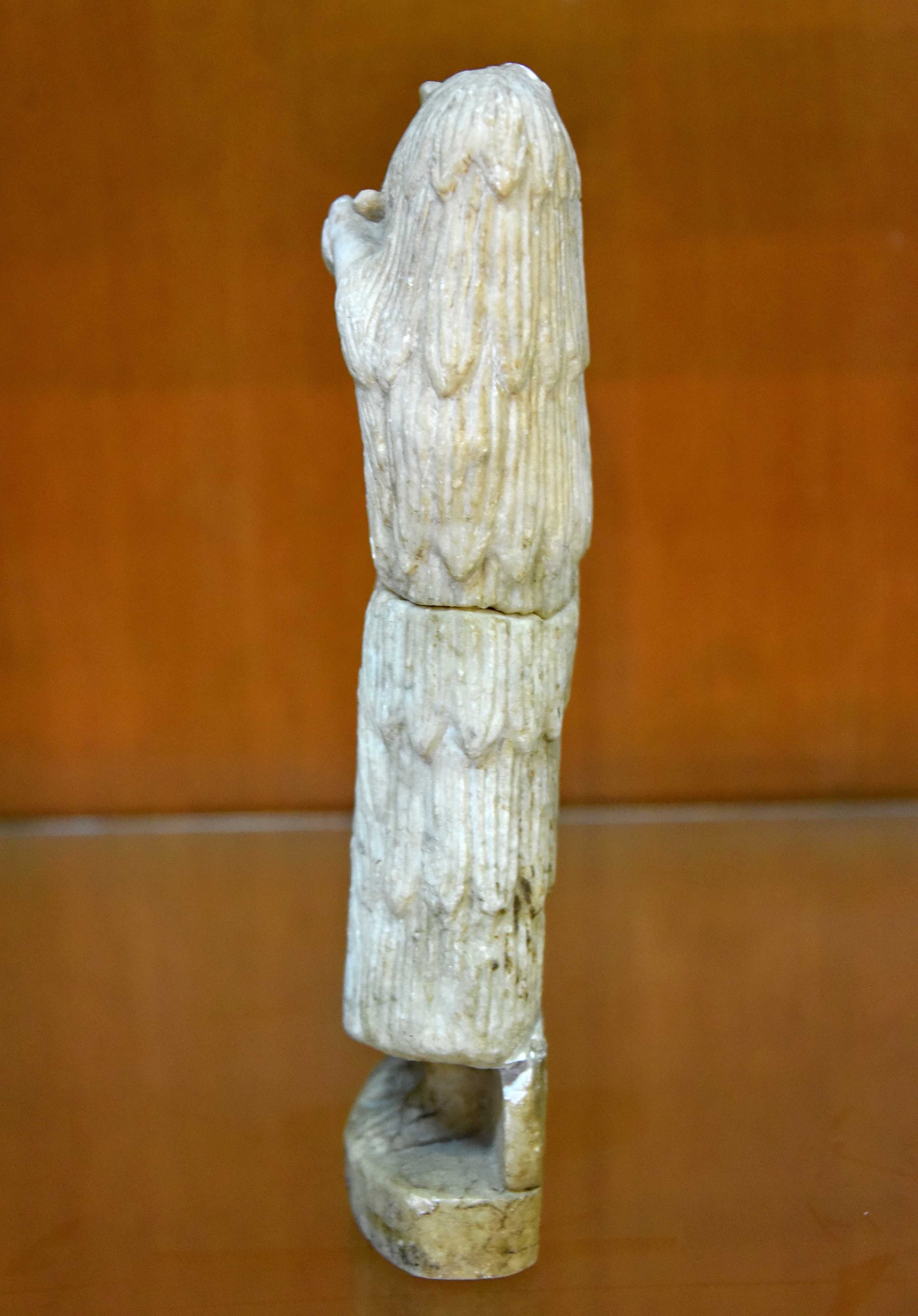 Limestone statue of a Sumerian female in a gesture of prayer. The head is lost. She wears the classical Sumerian flounced garment with a bare right shoulder. The feet stand on a semi-rectangular base with a back-pillar. Side view, left. From the Temple of Sin, Khafajah (also Khafaje; ancient Tutub), Dyala Governorate, Iraq; excavated by the Oriental Institute (Chicago), 4th season, 1933/1934 CE. Early Dynastic II, c. 2600 BCE. (The Sulaymaniyah Museum, Iraqi Kurdistan).