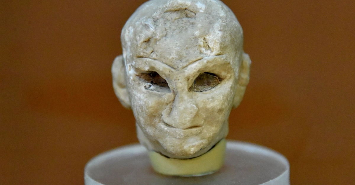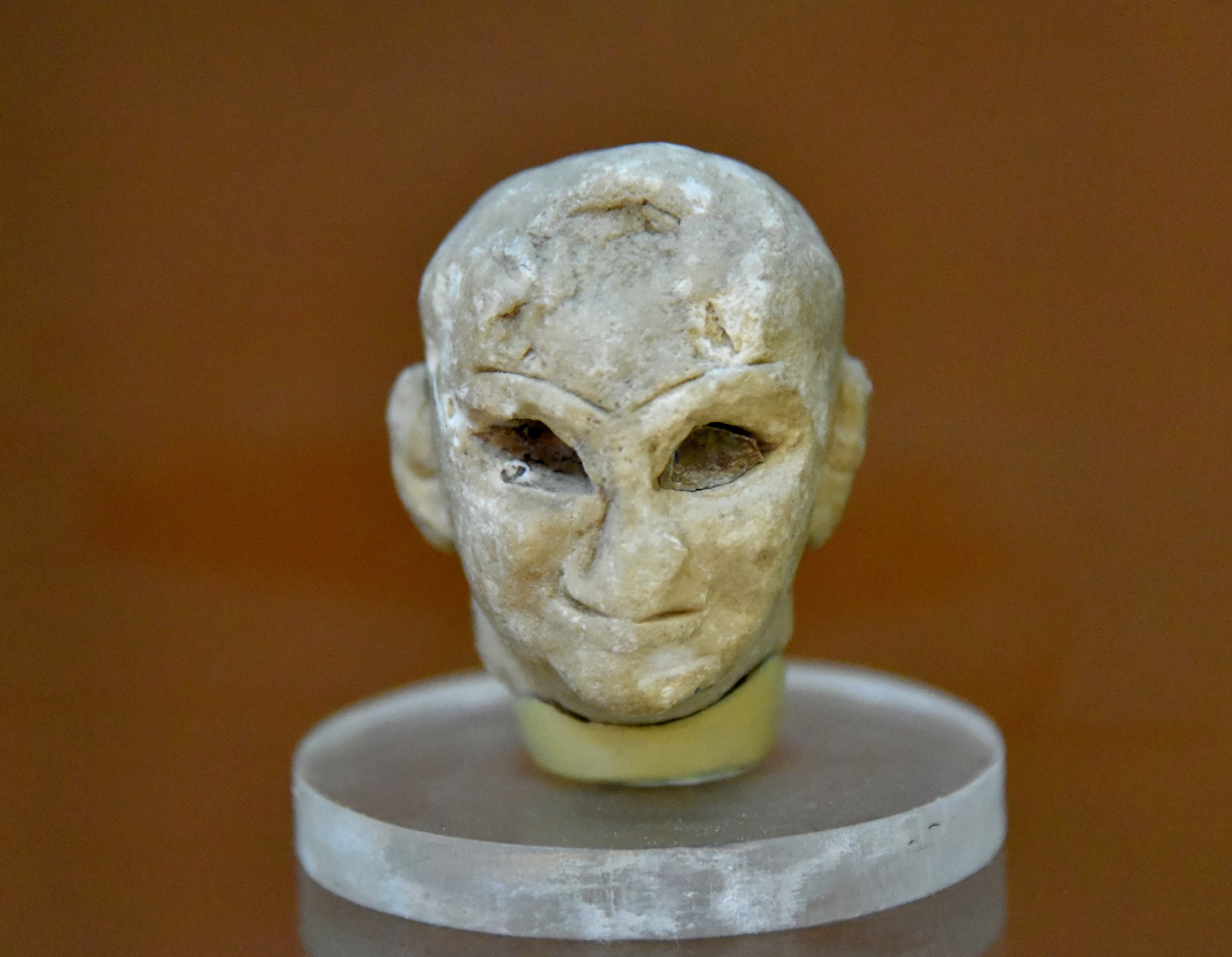 Limestone head of a statue of a Sumerian male; the rest of the body is lost. The eye sockets are empty but might well have been filled in with a white shell or a precious stone set in bitumen. Front view. From the Single-Shrine at the Temple of Abu, Tell Asmar (ancient Eshnunna), Dyala Governorate, Iraq; excavated by the Oriental Institute (Chicago), 1933/1934 CE. Early Dynastic III, c. 2400 BCE. (The Sulaymaniyah Museum, Iraqi Kurdistan).