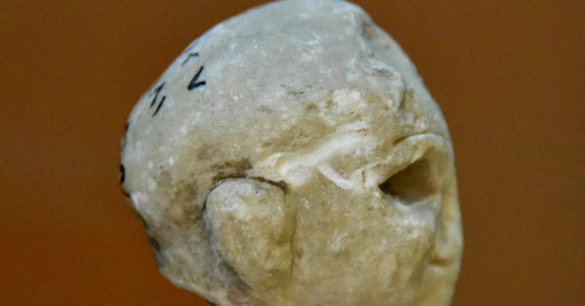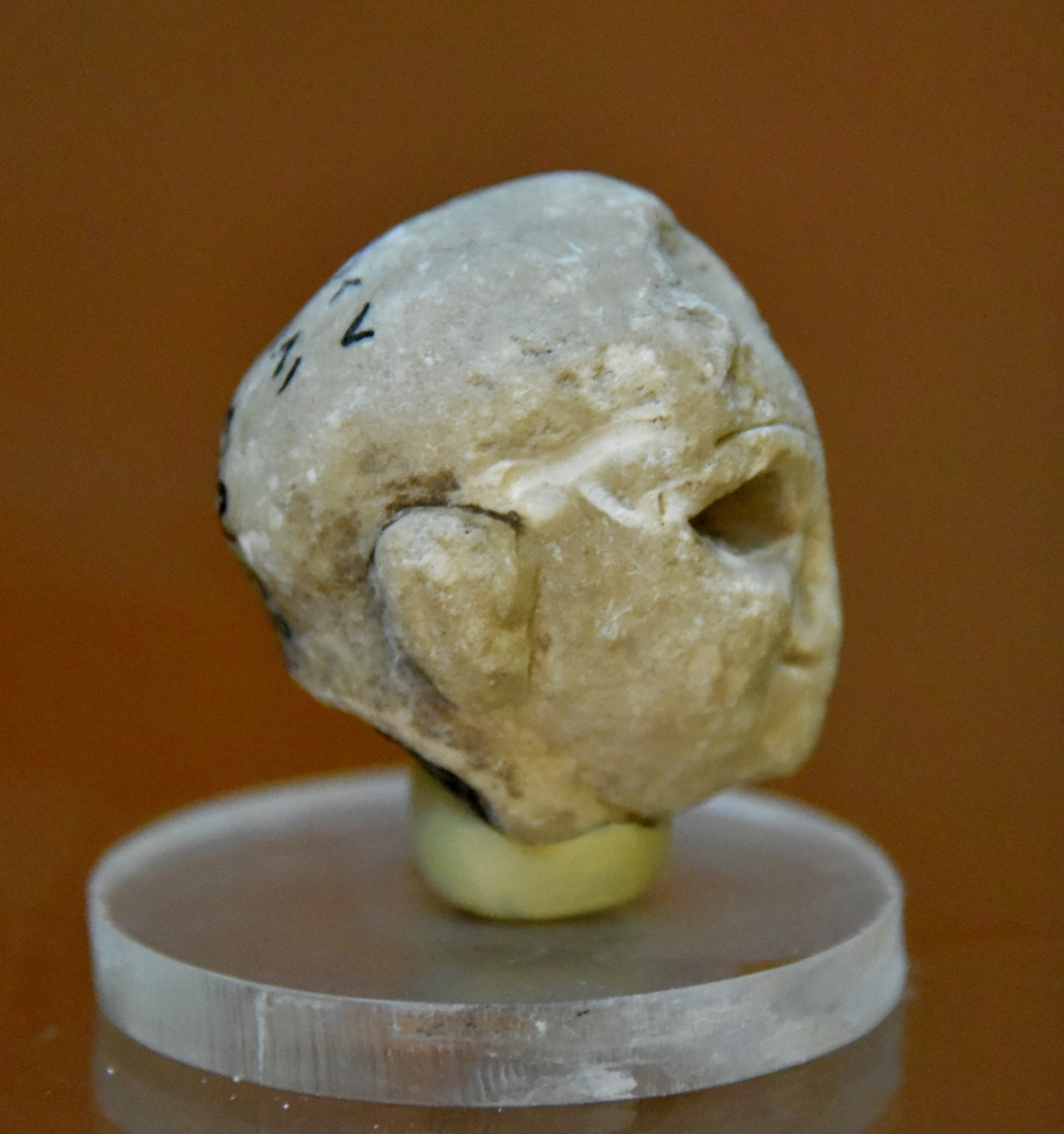 Limestone head of a statue of a Sumerian male; the rest of the body is lost. The eye sockets are empty but might well have been filled in with a white shell or a precious stone set in bitumen. Side view, right. From the Single-Shrine at the Temple of Abu, Tell Asmar (ancient Eshnunna), Dyala Governorate, Iraq; excavated by the Oriental Institute (Chicago), 1933/1934 CE. Early Dynastic III, c. 2400 BCE. (The Sulaymaniyah Museum, Iraqi Kurdistan).