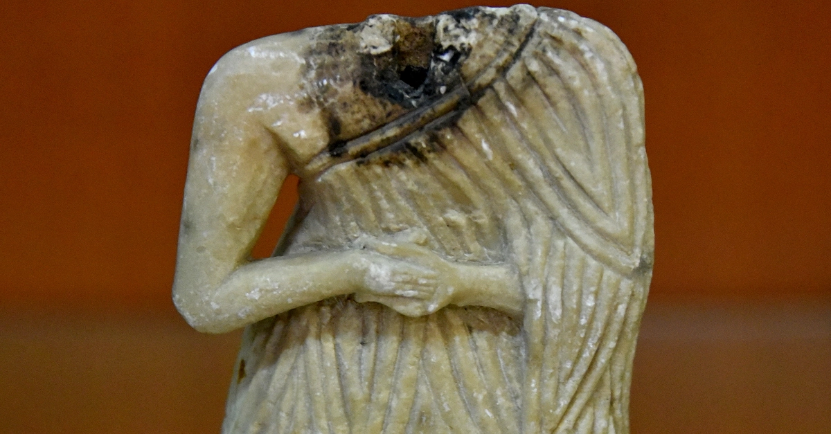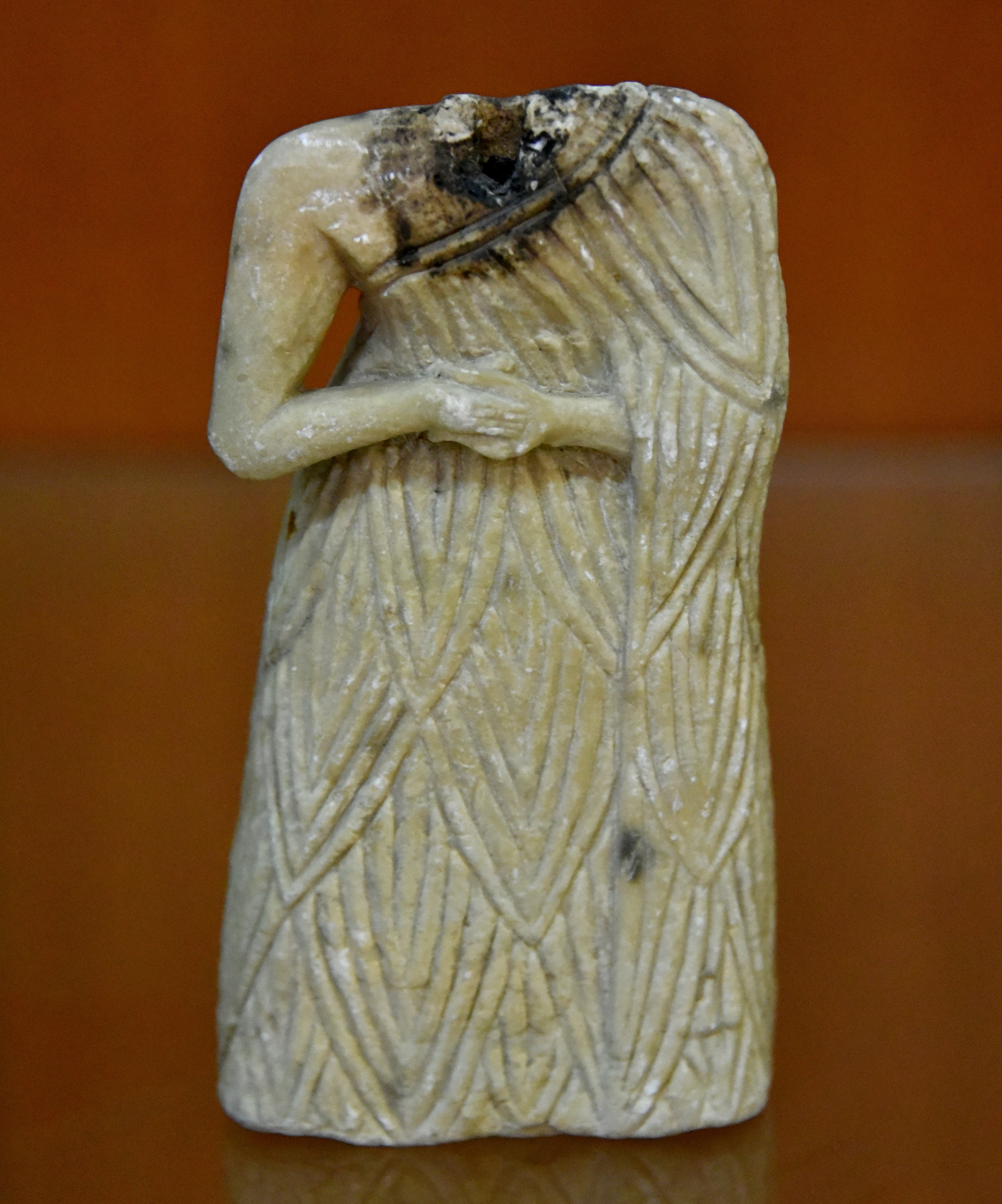 Limestone statue of a Sumerian female in a gesture of prayer. The head is lost but the color of a glue, which was used to join the head to the upper chest, is clear. The head was probably removed after some time, for some reason or another. She wears the classical Sumerian flounced garment with a bare right shoulder. There is a rounded dowel hole at the lower surface of the torso. Kh. IV 246, IM46221, SM180. From Khafajah (also Khafaje; ancient Tutub), Dyala Governorate, Iraq; Iraq; excavated by the Oriental Institute (Chicago), 4th season, 1933/1934 CE. Early Dynastic Period, 2900-2350 BCE. (The Sulaymaniyah Museum, Iraqi Kurdistan).