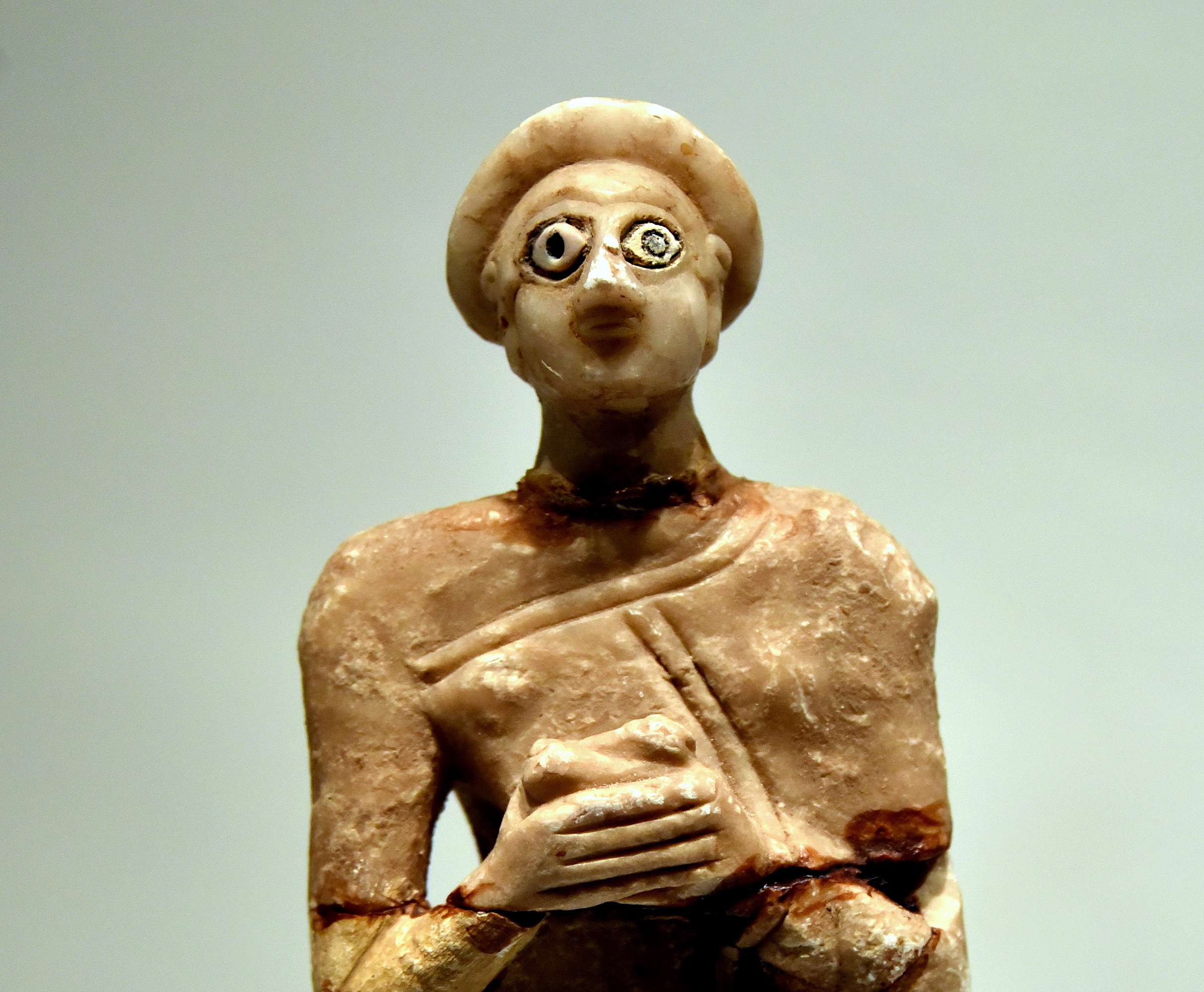Detail of a limestone statue of a Sumerian female in a gesture of prayer. The eye sockets were filled in with white shell set in bitumen. She wears a Sumerian garment with a bare right shoulder. Front view. From the Temple of Sin, Khafajah (also Khafaje; ancient Tutub), Dyala Governorate, Iraq; excavated by the Oriental Institute (Chicago), 4th season, 1933/1934 CE. Early Dynastic III, c. 2400 BCE. (The Sulaymaniyah Museum, Iraqi Kurdistan).
