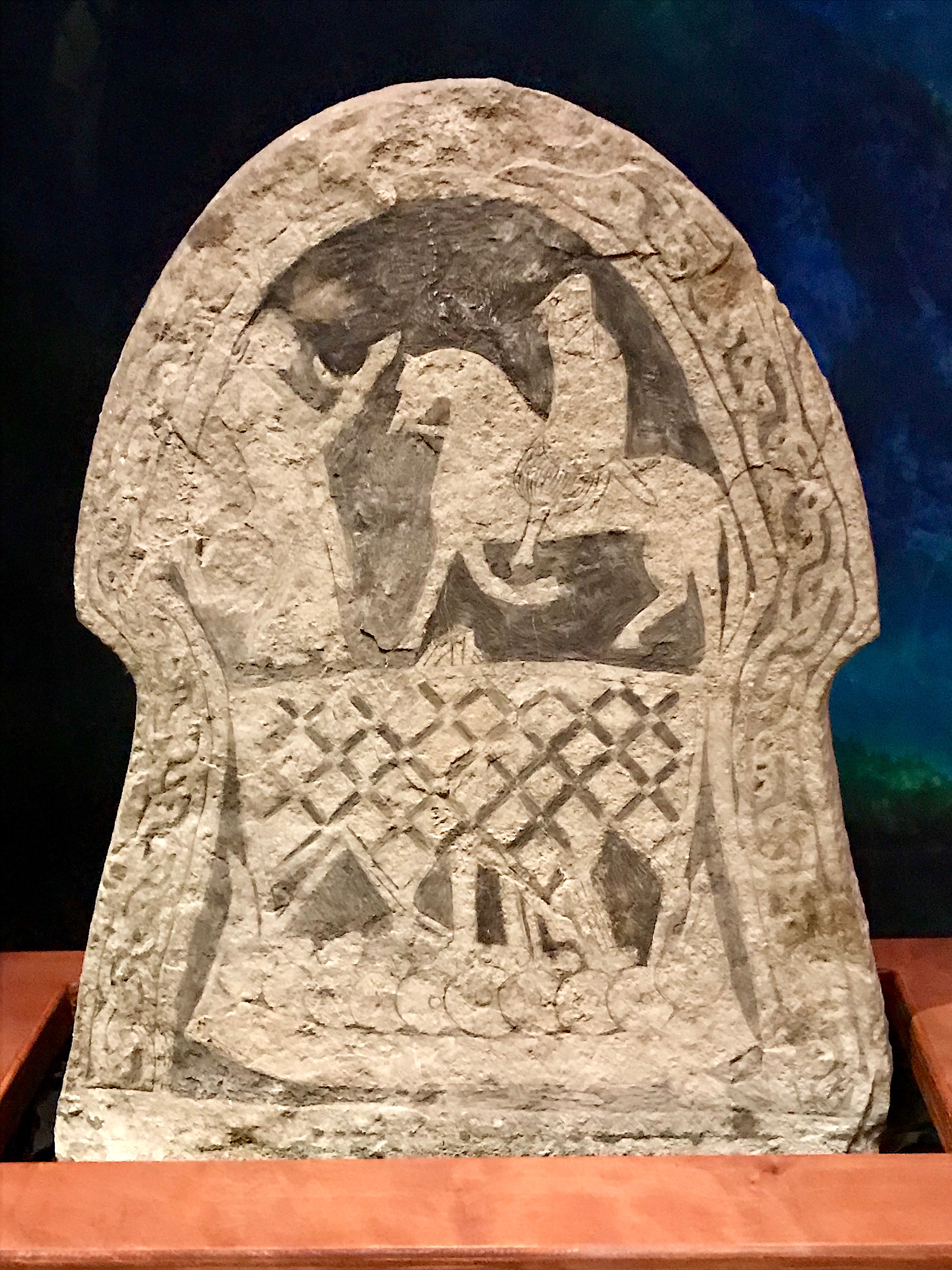 More than a thousand years ago, Vikings living on the Swedish Island of Gotland erected carved stone slabs to commemorate fallen warriors and heroic deeds. This stone is called the "Broa Stonem" and it dates to c. 700-800 CE. Today, these ancient picture stones and runestones, which often depicted Norse myths and gods, are considered the most direct and authentic source of information about Norse mythology. The bottom of these picture stones always shared a common motif: a scene of a large Viking shop with its sail unfurled, perhaps carrying fallen warriors to the afterlife. The top scene of this picture stone depicts a female figure holding a cup or horn of mead, welcoming a man on a horse. Some Viking scholars believe this figure represents the goddess Freya, while others interpret the figure as a Valkyrie, which was one of the female deities who flew over battlefields and selected which soldiers would live or die. (Gotland Museum, Visby, Sweden.)