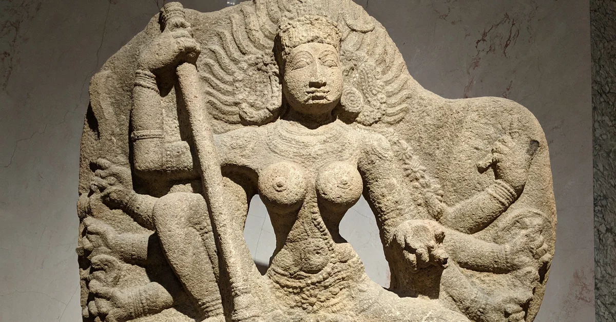 The goddess Durga slaying the buffalo demon Mahisha. This sculpture shows the terrifying goddess while killing a demon. In her hands she holds her typical attributes of a trident, skull drum, sacrificial knife, sling, shield, bell, and a blood bowl. India, Tamil Nadu, Chola Dynasty, 11th / 12th century CE. Exhibited at Museum Rietberg, Zurich, Switzerland.