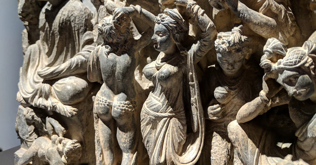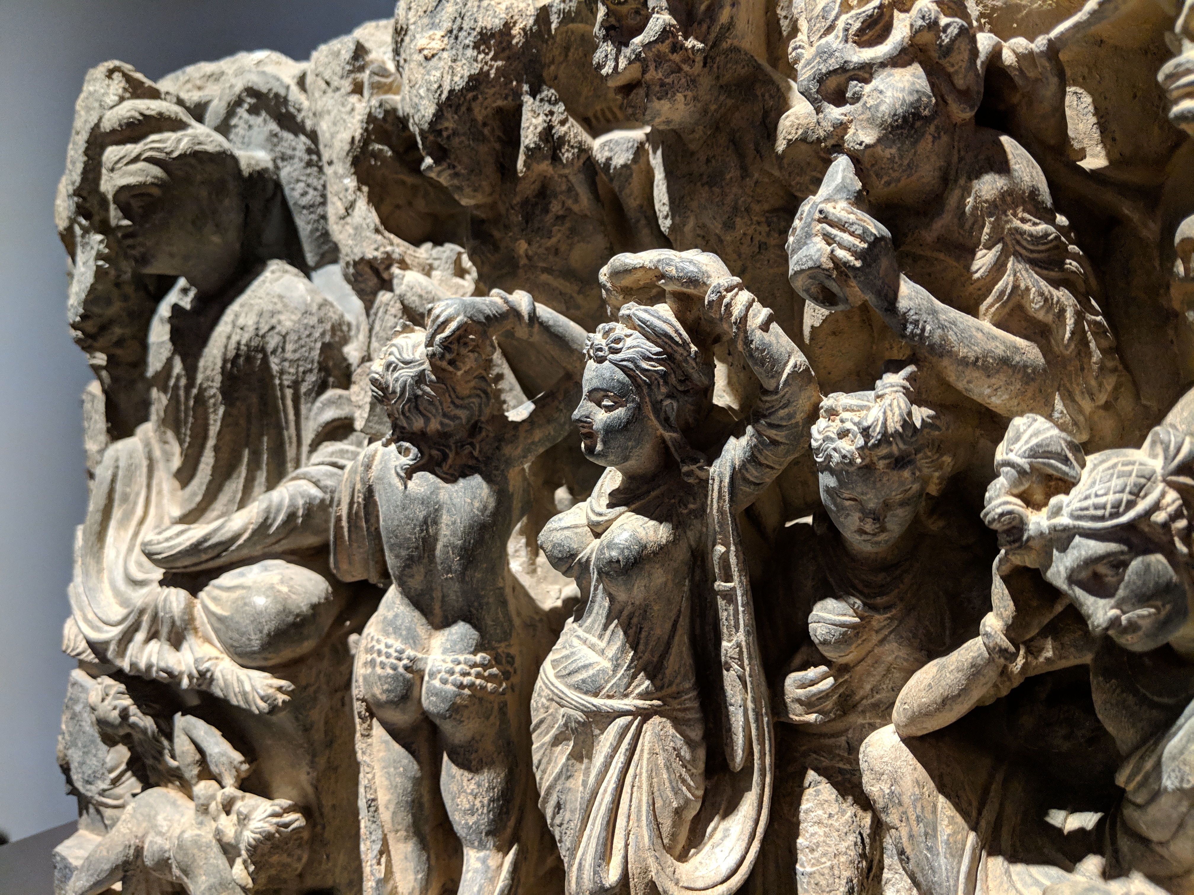 The temptation of the Buddha by Mara's daughters. Slate, Gandhara region, Pakistan, 2nd to 4th century CE. Exhibited at Museum Rietberg, Zurich, Switzerland.