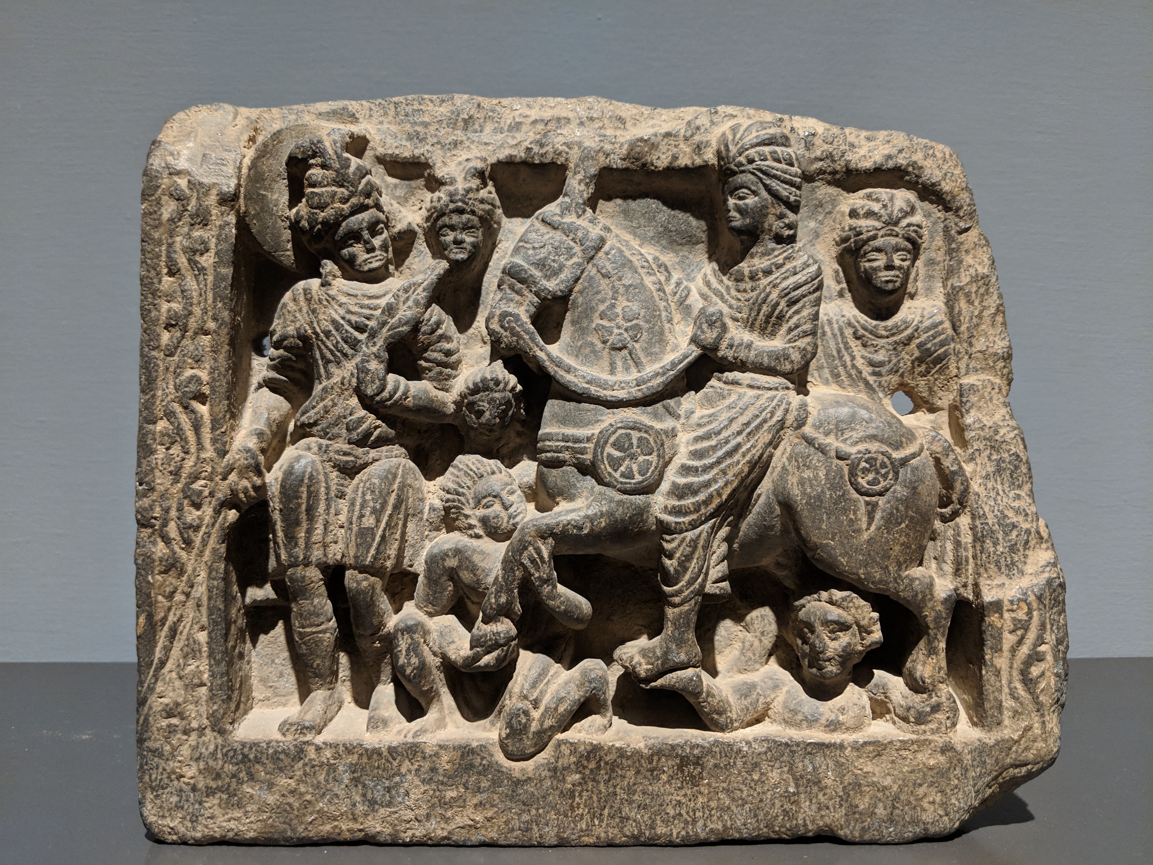 The prince Siddhartha secretly leaves the palace of his father. Not to wake the sleeping inhabitants of the palace, yakshas lift his horse on its hooves and carry it above the ground. Gandhara region, Pakistan, 3rd / 4th century CE. Exhibited at Museum Rietberg, Zurich, Switzerland.