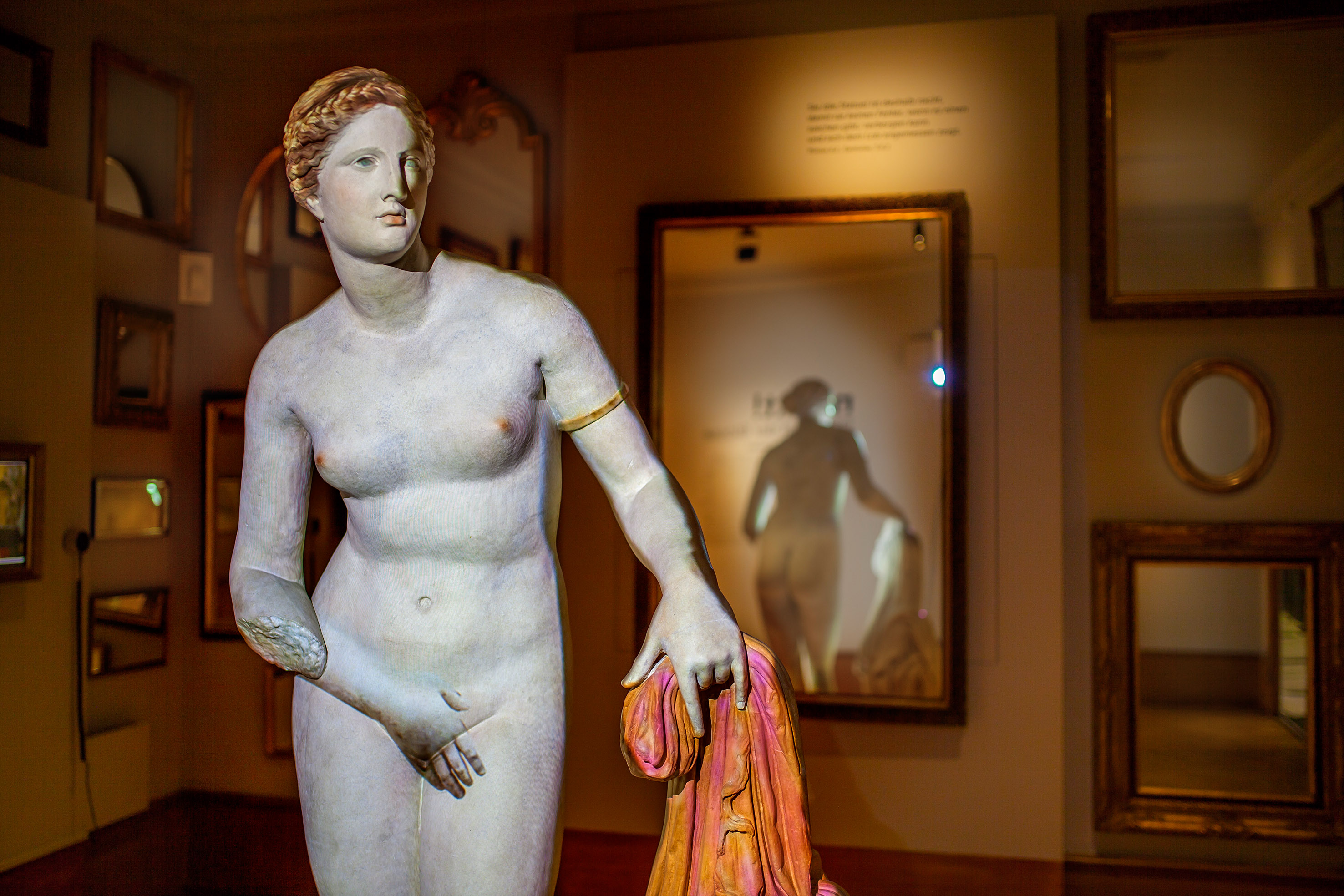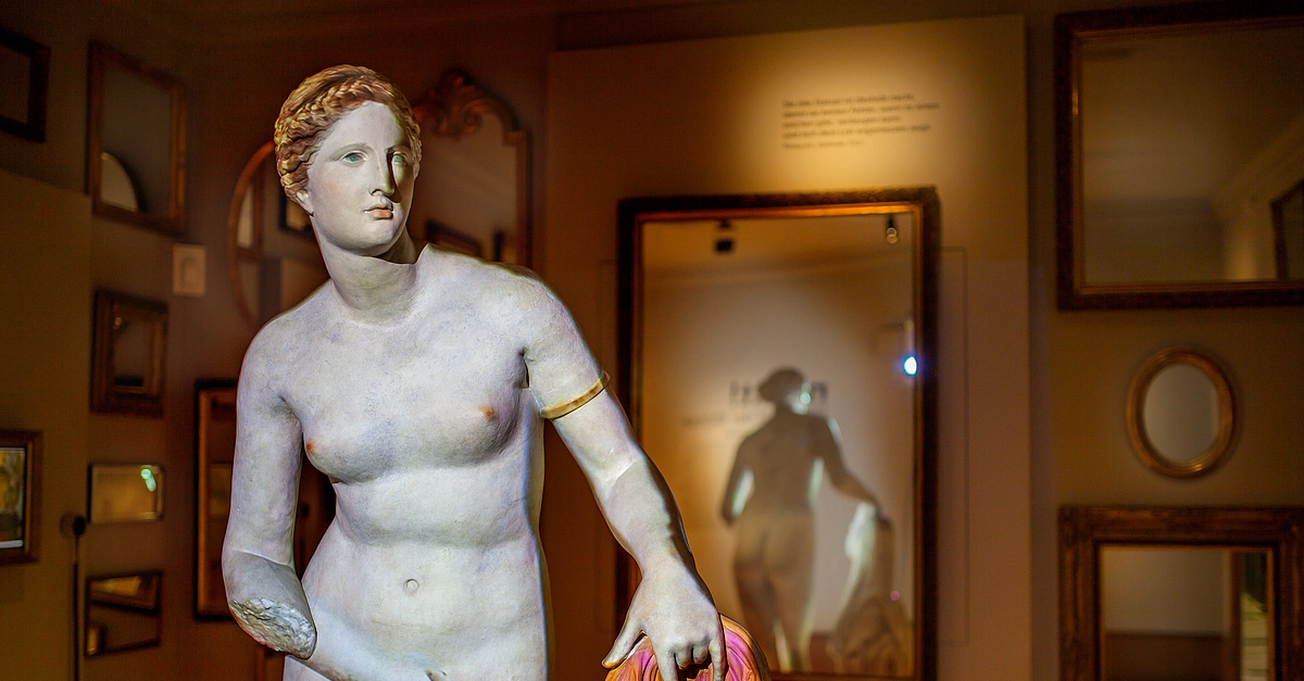 The Aphrodite of Knidos in a reconstruction from plaster casts and “completed” by projected colours suggesting her former polychromy. This famous statue, created by Praxiteles around 340 BCE, was originally set up in the Aphrodite sanctuary in Knidos (Asia Minor). On display as part of the 2018 CE exhibition 'Naked! The Art of Nudity' at the Antikenmuseum, Basel, Switzerland. © Ruedi Habegger, Antikenmuseum Basel und Sammlung Ludwig