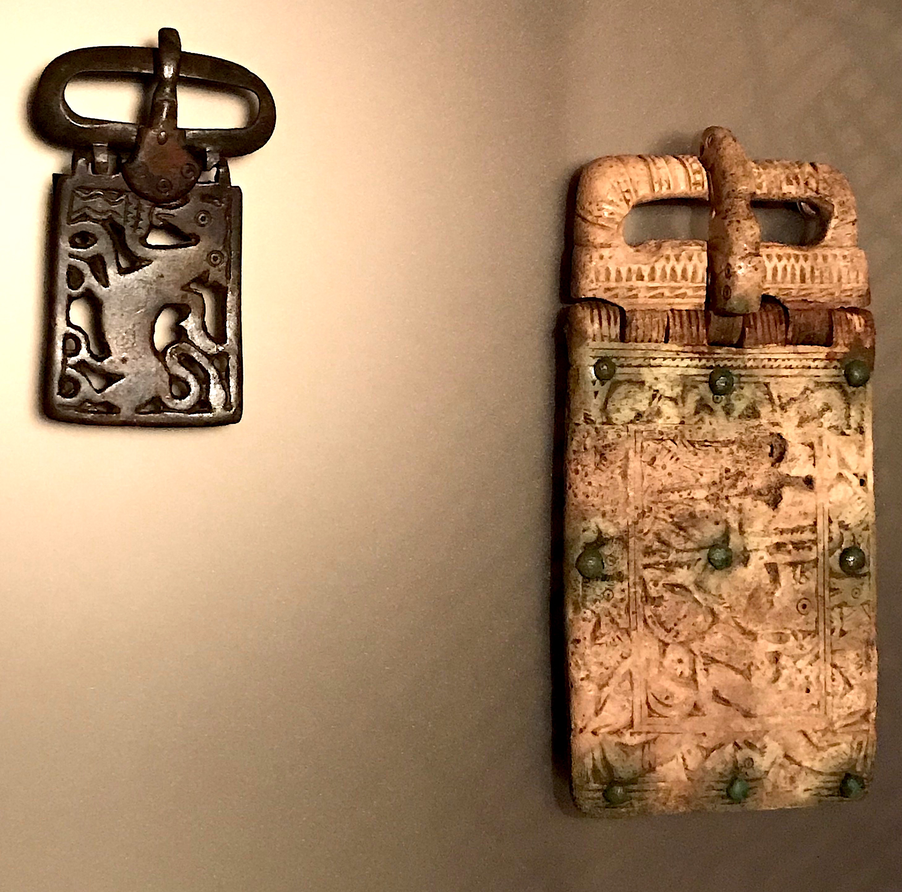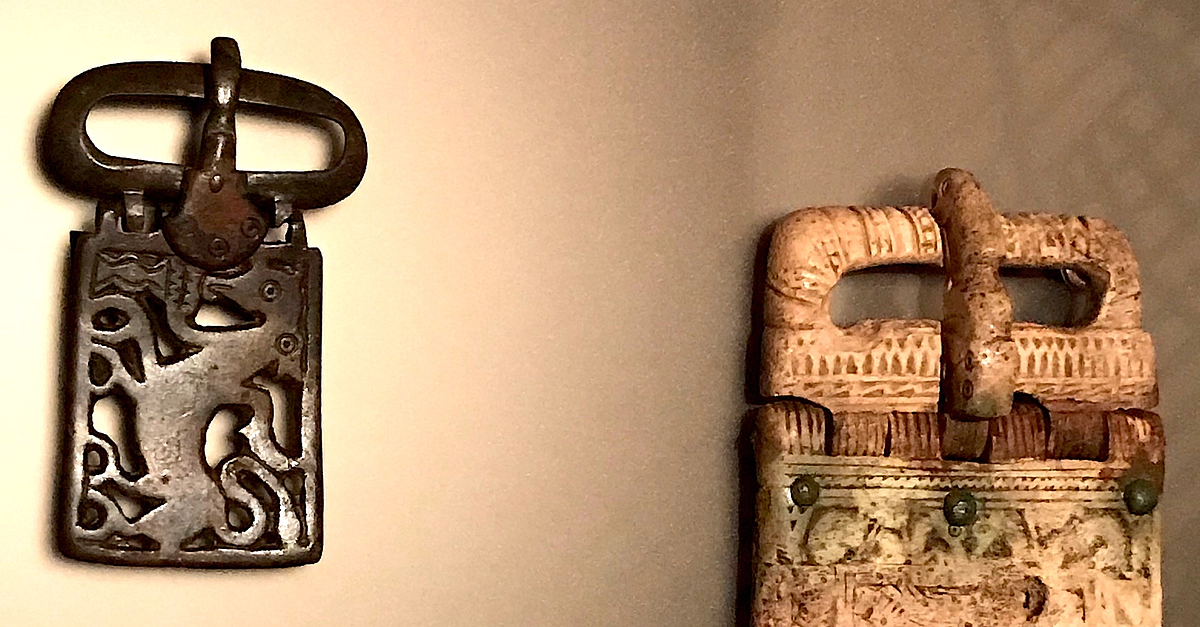 These Alemanni belt buckles are made from elk antlers and bronze. They date from the 6th or 7th century CE and come from a cemetery in Kallnach-Bergweg, which is located in Canton Bern, Switzerland. (Landesmuseum, Zürich.)