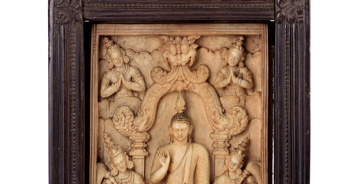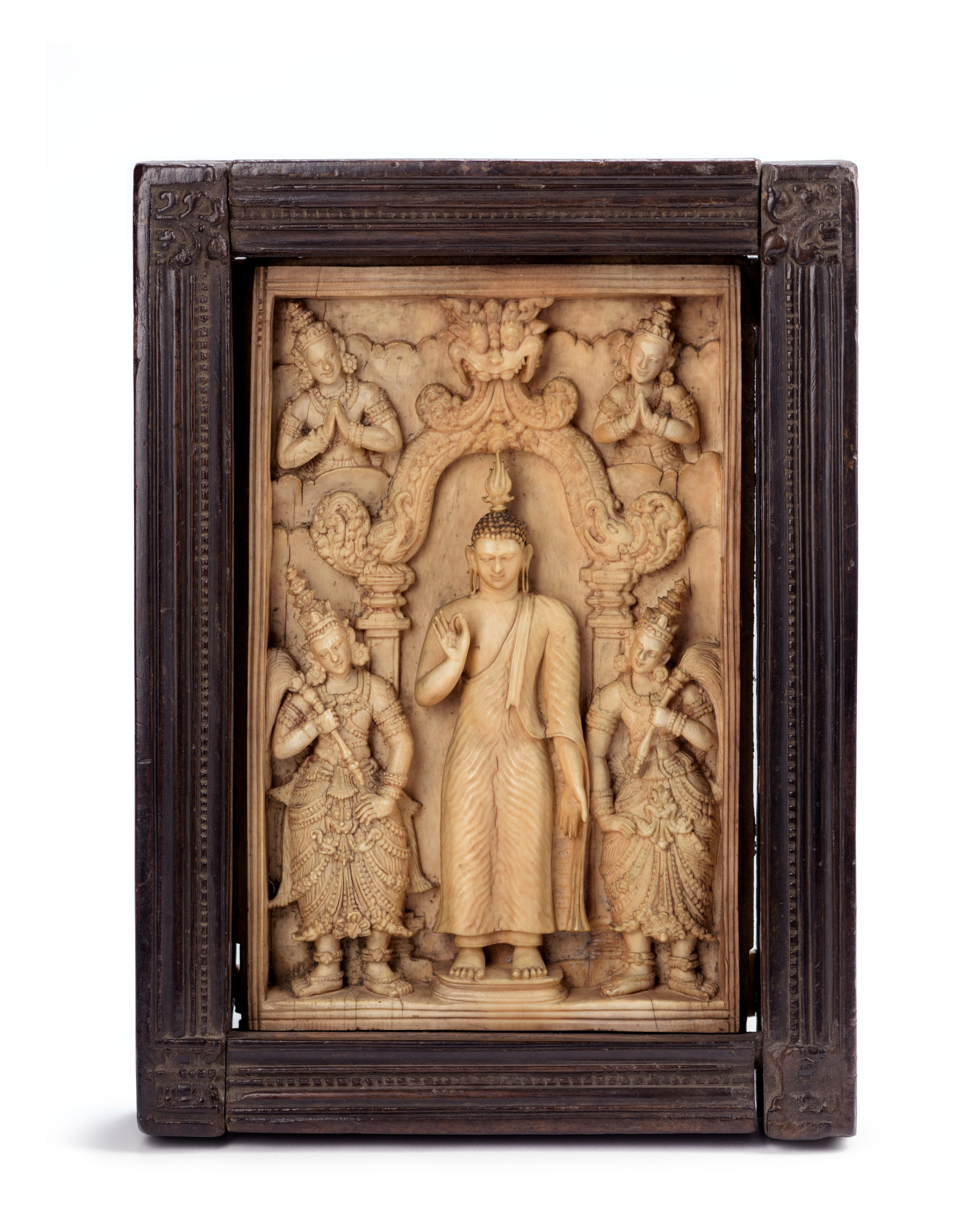 Buddha Shakyamuni and Attendants, Sri Lanka. 18th century CE, ivory with paint; ebony frame. On display as part of 'The Jeweled Isle: Art from Sri Lanka' exhibition, at the LACMA in Los Angeles, California (2018-19)