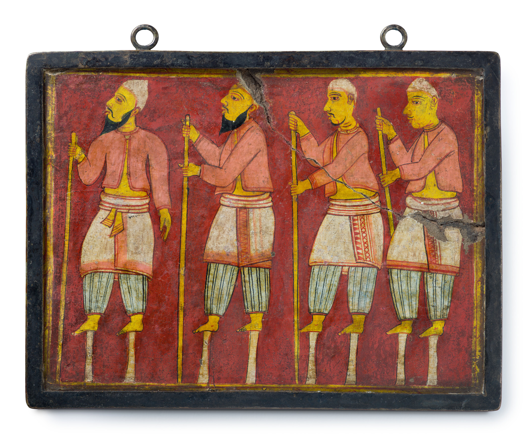 Tile with Stilt-Walkers, late 18th century CE, opaque watercolor on terracotta. Sri Lanka. On display as part of 'The Jeweled Isle: Art from Sri Lanka' exhibition, at the LACMA in Los Angeles, California (2018-19)