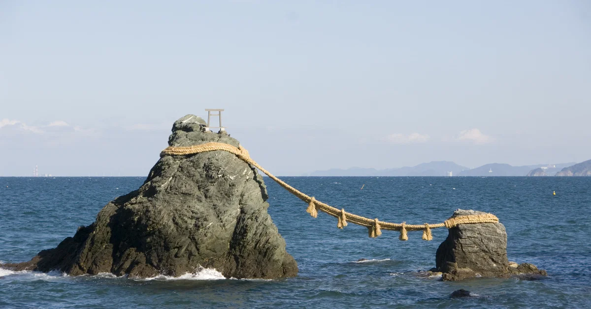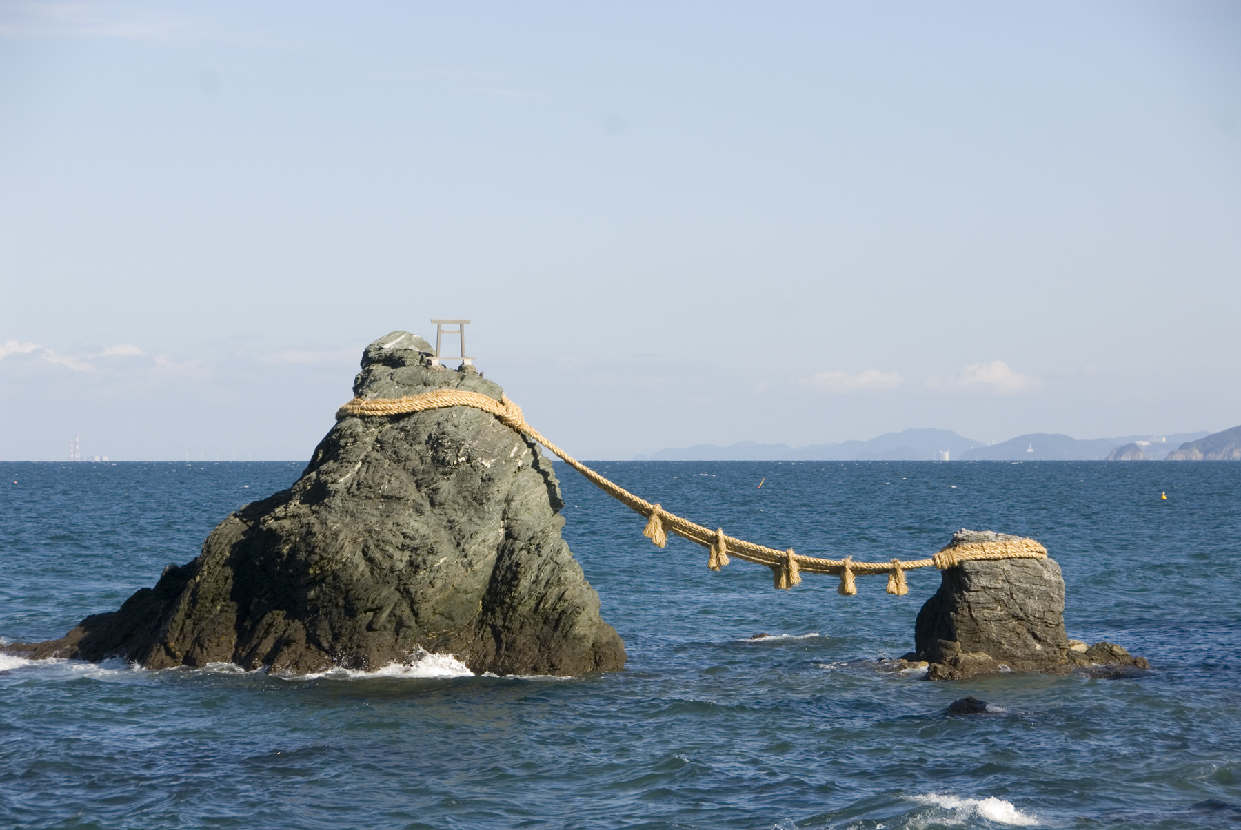The wedded rocks known as Meoto-iwa are located in Japan near Ise jingu. They represent the two creator gods of the Shinto religion, Izanami and Izanagi. The rocks are joined by a sacred rope (shimenawa) of plaited rice stalks which symbolizes the marriage bond between the two gods. The white gate or torii can be seen on the larger rock (Izanagi) which marks the site as sacred.