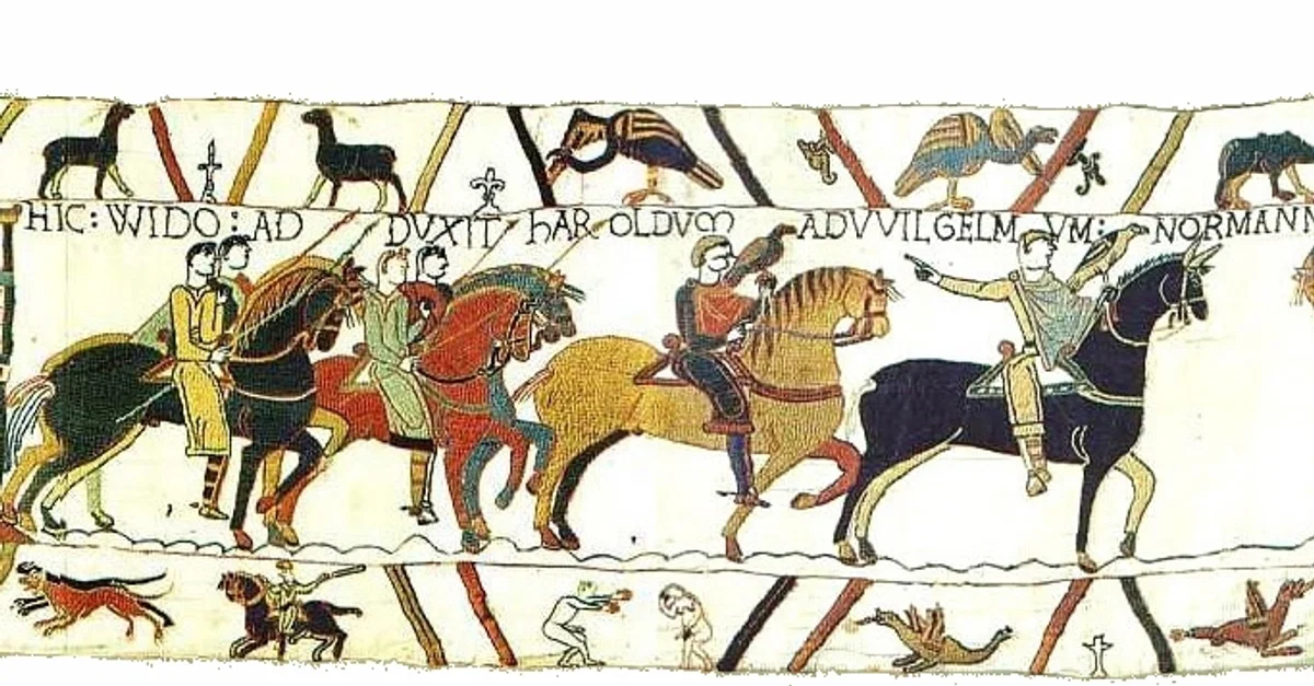 A depiction of Harold Godwinson (Harold II), king of England (r. 1064-1066 CE) hawking. From the Bayeux Tapestry, 1067-1079 CE. (Centre Guillaume le Conquérant, Bayeux, France)