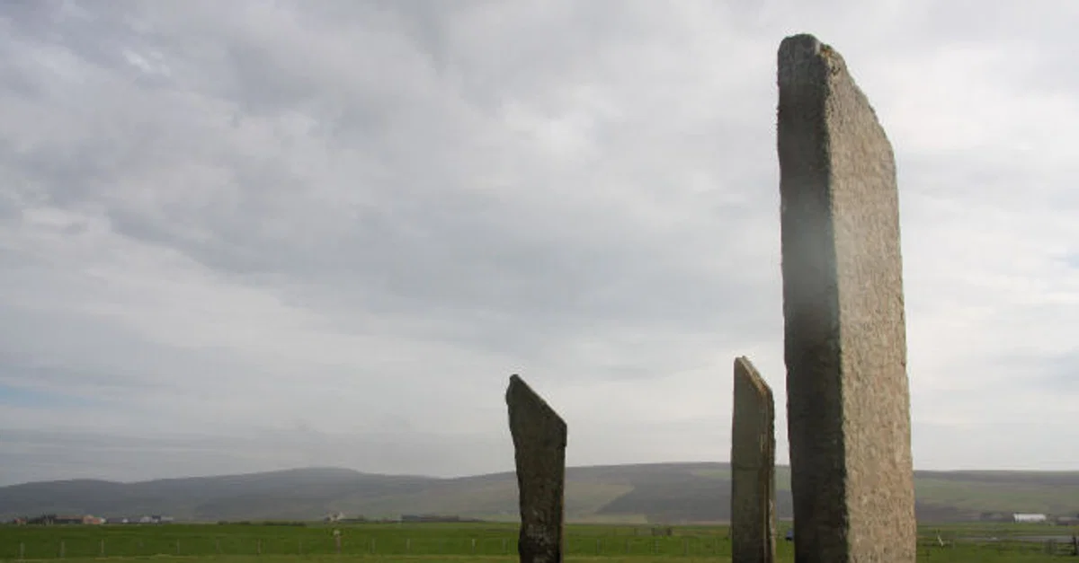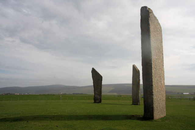 The so-called Standing Stones of Stenness is a Neolithic monument on the island of Orkney, Britain. The four standing stones (each about 300 mm thick and measuring up to 5 m tall) were once part of a massive henge monument which included perhaps 12 standing stones in total.