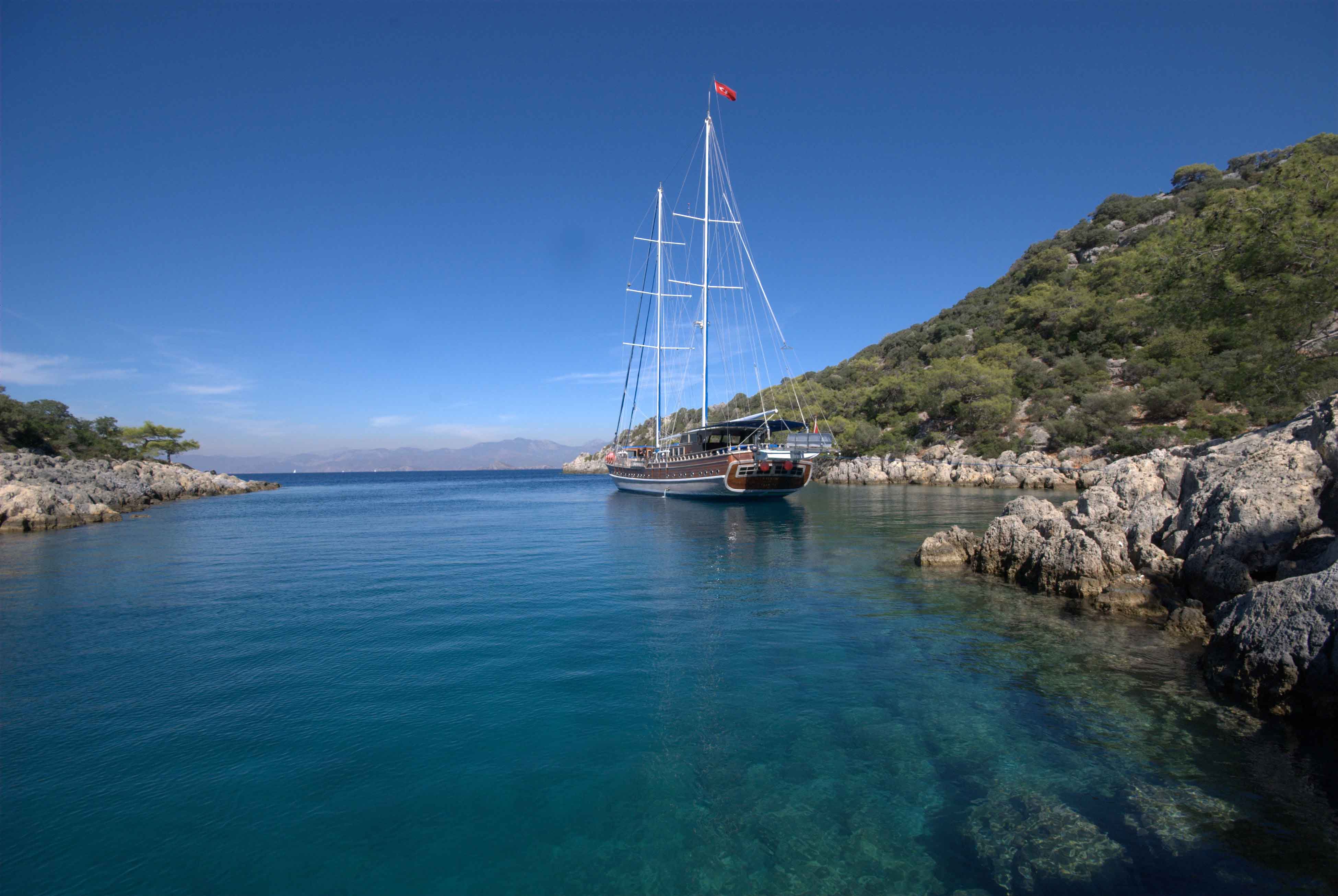 A gulet, a traditional two-masted Turkish sailing boat, anchored on the Lycian coastline. Photography by Peter Sommer Travels, republished with permission.