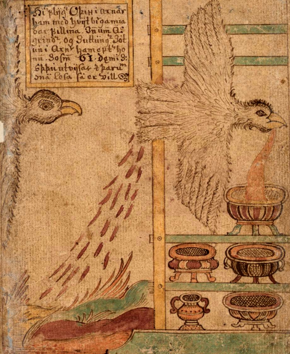 An 18th century CE Icelandic manuscript illustration showing the Norse god Odin in the guise of an eagle which produces the drink mead. (Árni Magnússon Institute, Iceland)