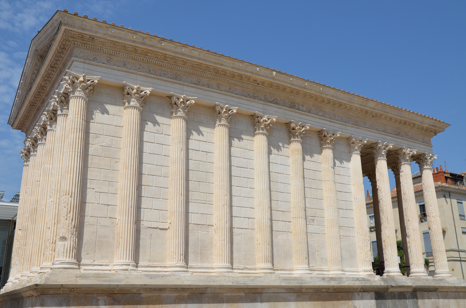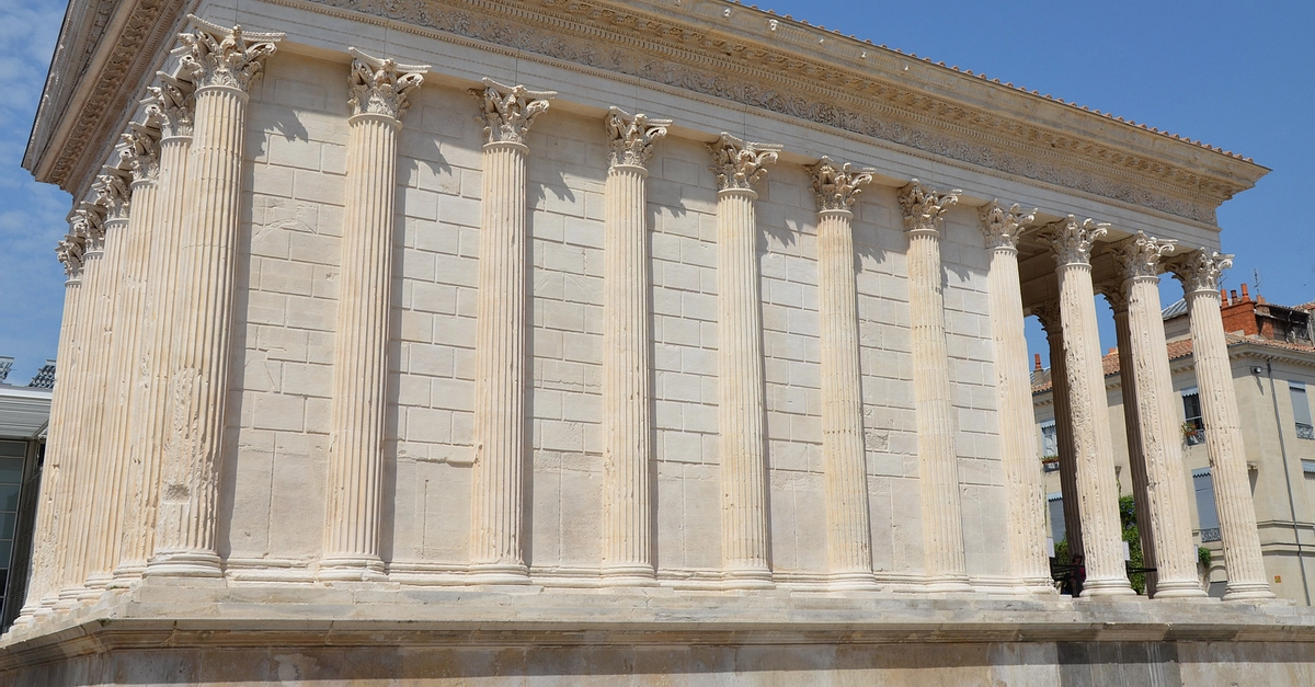 The Maison Carrée, Nîmes, France. This ancient Roman temple was constructed around 4 to 7 CE and dedicated to Gaius Caesar and Lucius Caesar, the grandsons and adpoted heirs of Emperor Augustus. It represents the best-preserved Roman temple facades today.