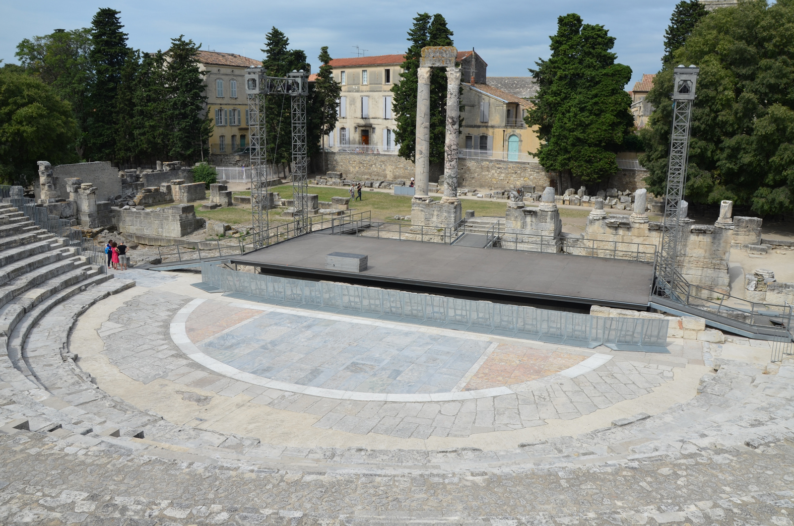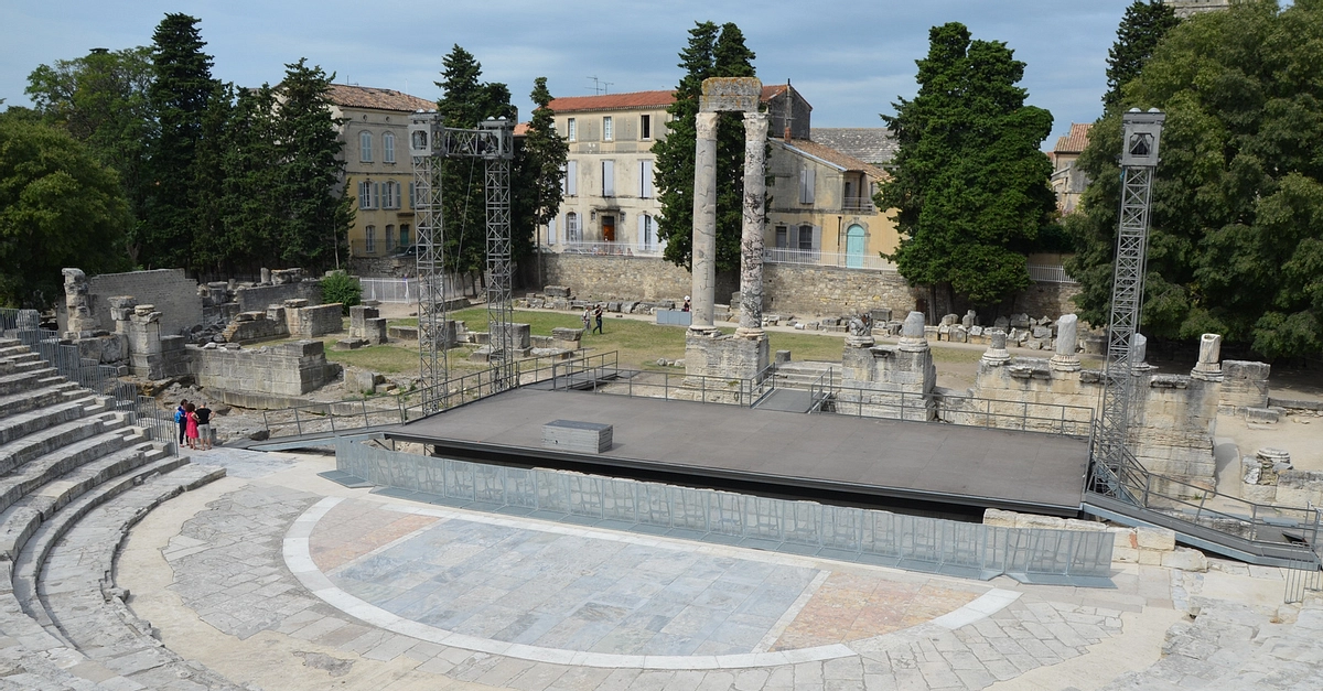 The Roman Theatre of Arelate (modern-day Arles, France) was built in the first century CE during the reign of Emperor Augustus. During the Middle Ages, its stones were often pillaged to construct nearby buildings. Today, only seating rows, an orchestra section, a stage area and two marble columns remain.