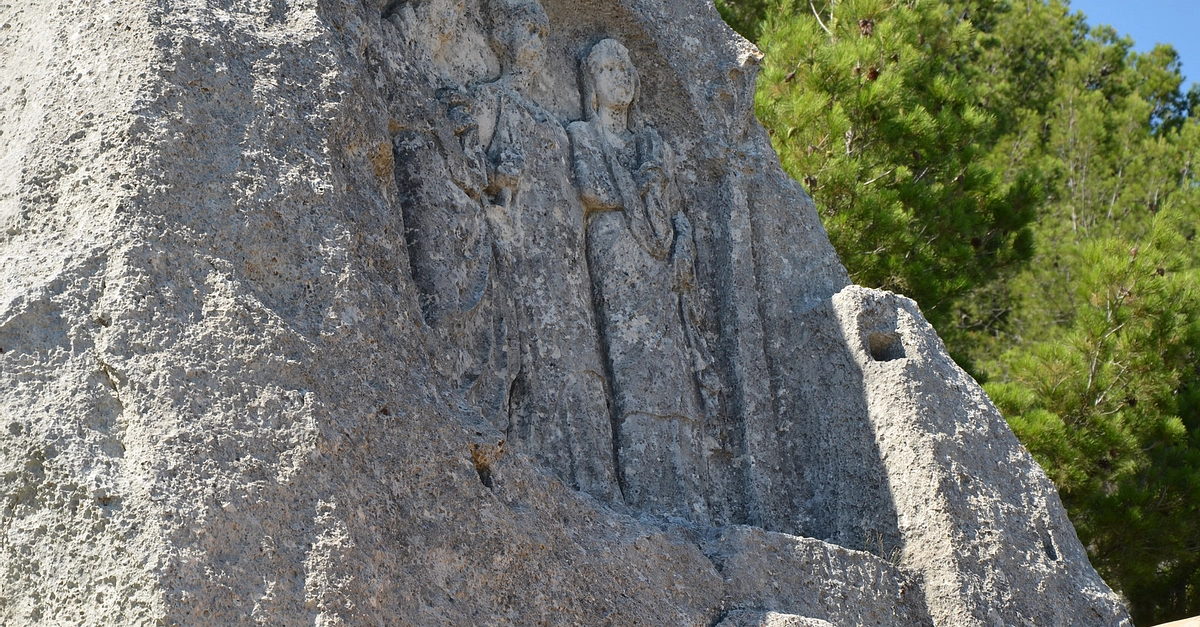 Les Trémaïé, a bas-relief from the Gallo-Roman Period carved out from a rock-cut hill depicting Roman figures, Les Baux-de-Provence, France.