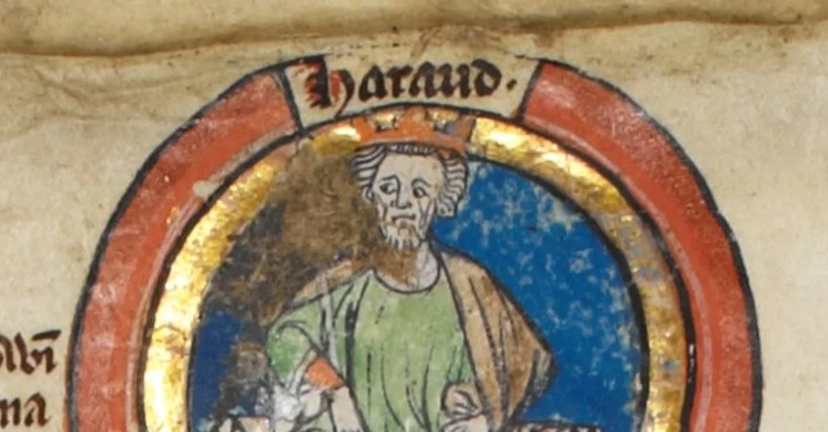 A 14th century CE medieval manuscript illustration showing Harold Godwinson, aka Harold II, the Anglo-Saxon king of England from January to October 1066 CE. (Genealogical roll of the kings of England, British Museum, London)