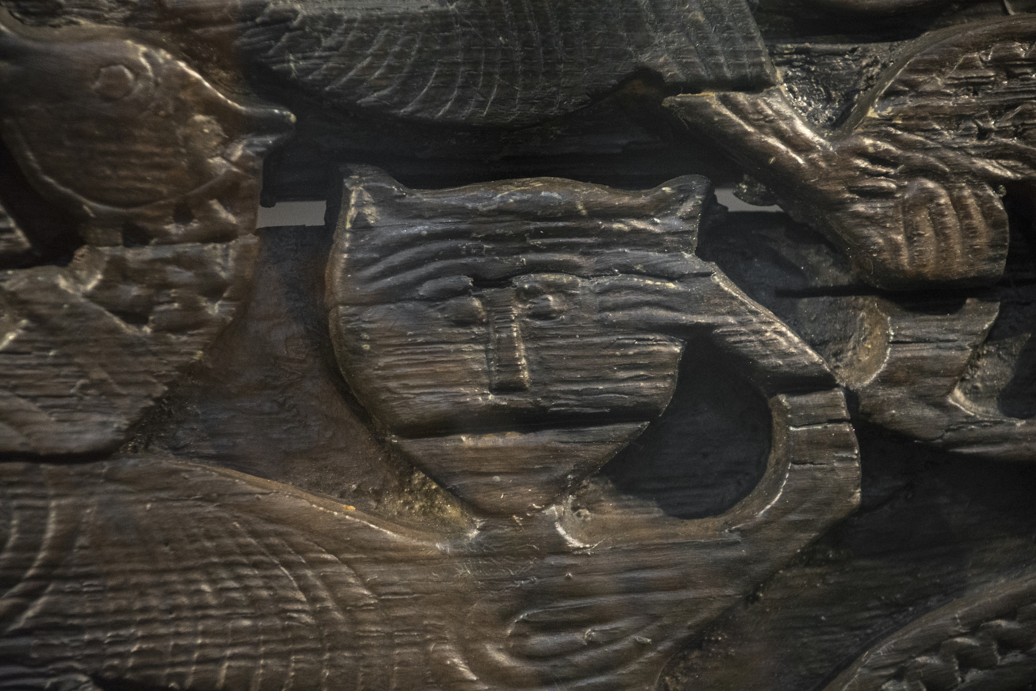 Carved animal head, possibly a cat, on the Oseberg Viking ship.