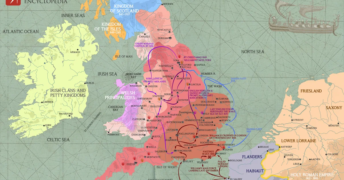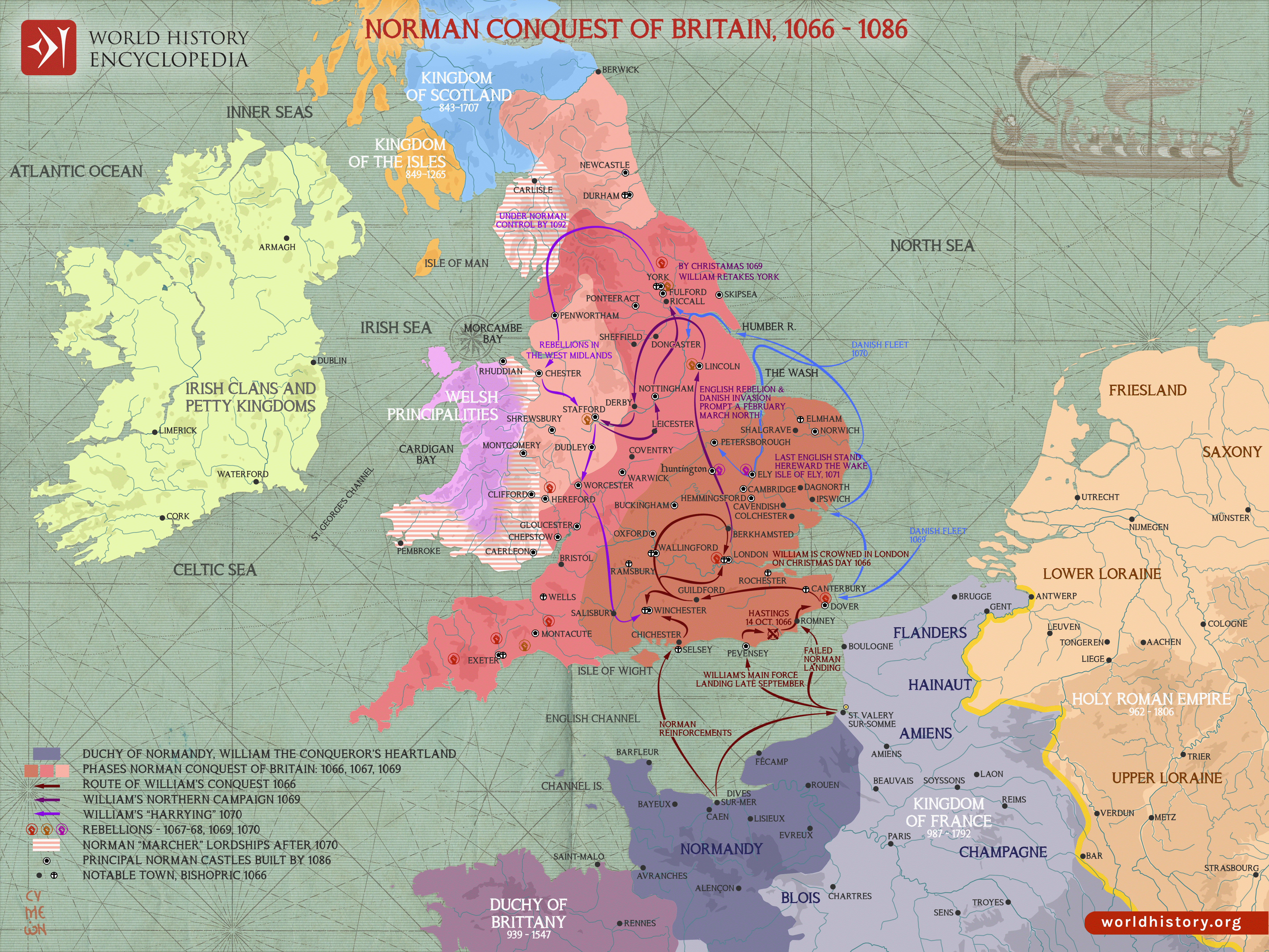 Netchev, S. (2019, January 17). Map of the Norman Conquest of Britain, 1066 - 1086: From Hastings to Domesday – The Making of Norman England. World History Encyclopedia. https://www.worldhistory.org/image/9862/map-of-the-norman-conquest-of-britain-1066---1086/