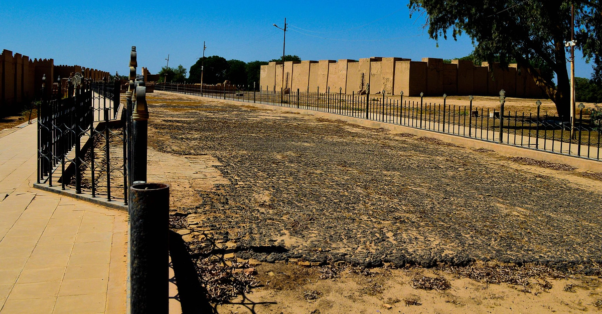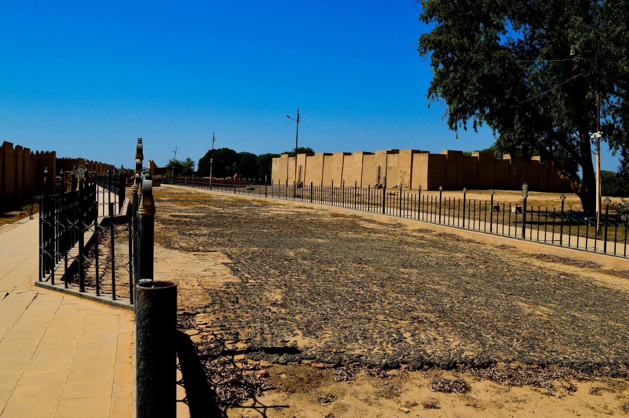 Once you enter the ancient city of Babylon, you will face this. This is the beginning of the Processional Way. The street is surrounded by a fence. The original tiles are still in their places and are covered with bitumen.