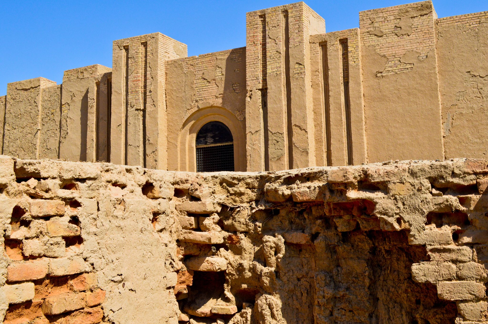 Ninmah Temple appears behind ruins of a low-lying flat building (which is thought to represent an altar). Modern reconstruction, Babylon.