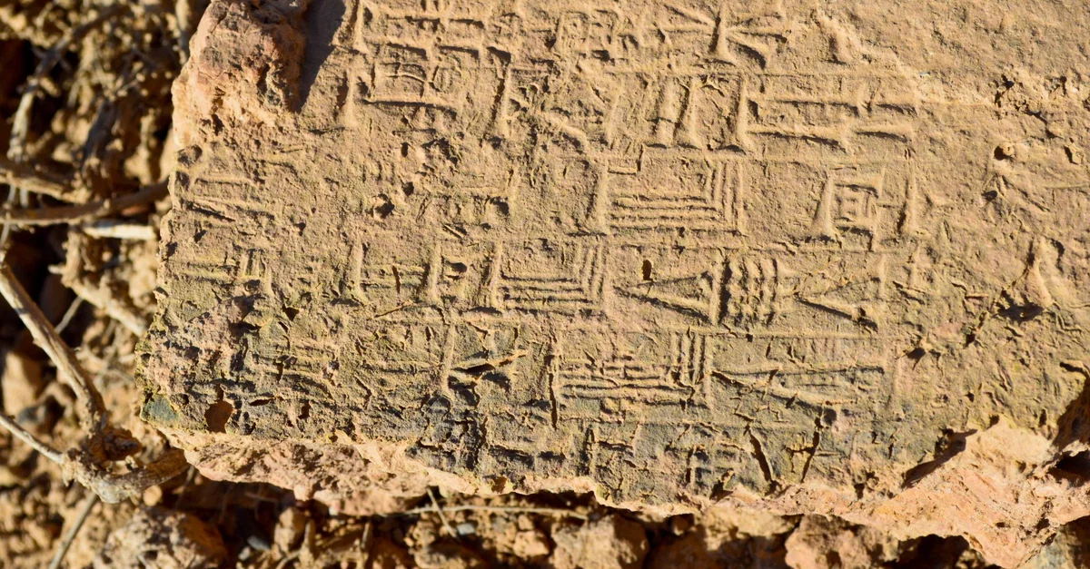 A close-up view of a partially broken stamped mud-brick. I found the brick on the earth! Babylon, modern-day Bebel Governorate, Iraq.