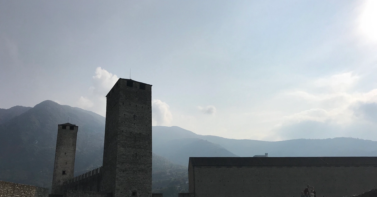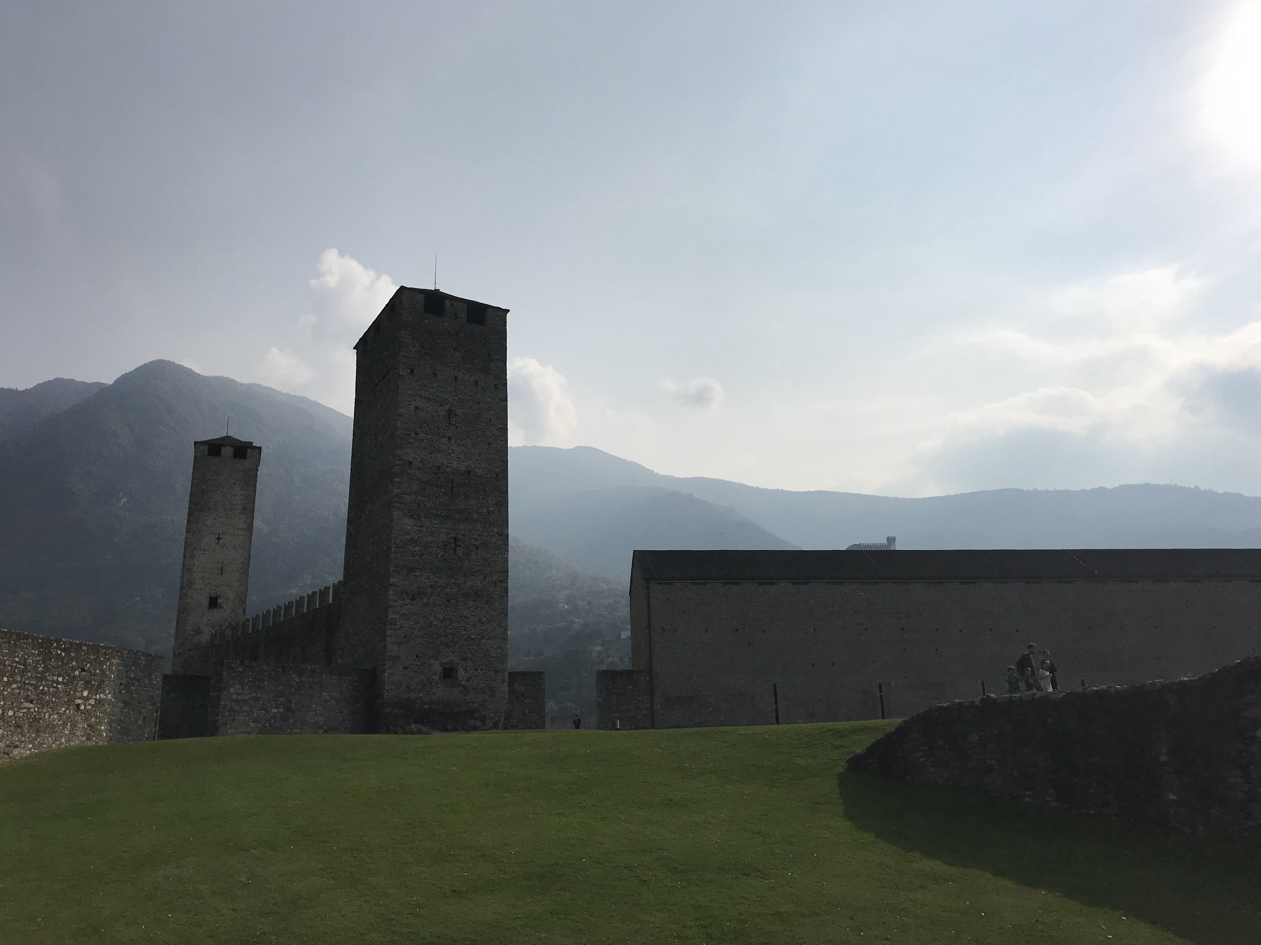 This is a picture of the Black Tower (Italian: Torre Nero) in the foreground and White Tower (Italian: Torre Bianca) in the background at the medieval fortress of Castelgrande in Bellinzona, Switzerland.