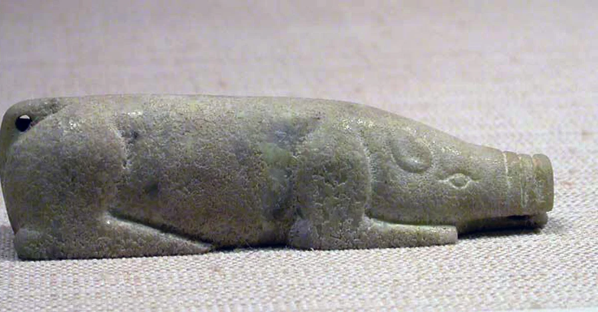 A dolomite sculpture of a recumbent pig. Eastern Han Dynasty, 25-220 CE. Height: 3 cm. Length: 10.6 cm. (Metropolitan Museum of Art, New York)