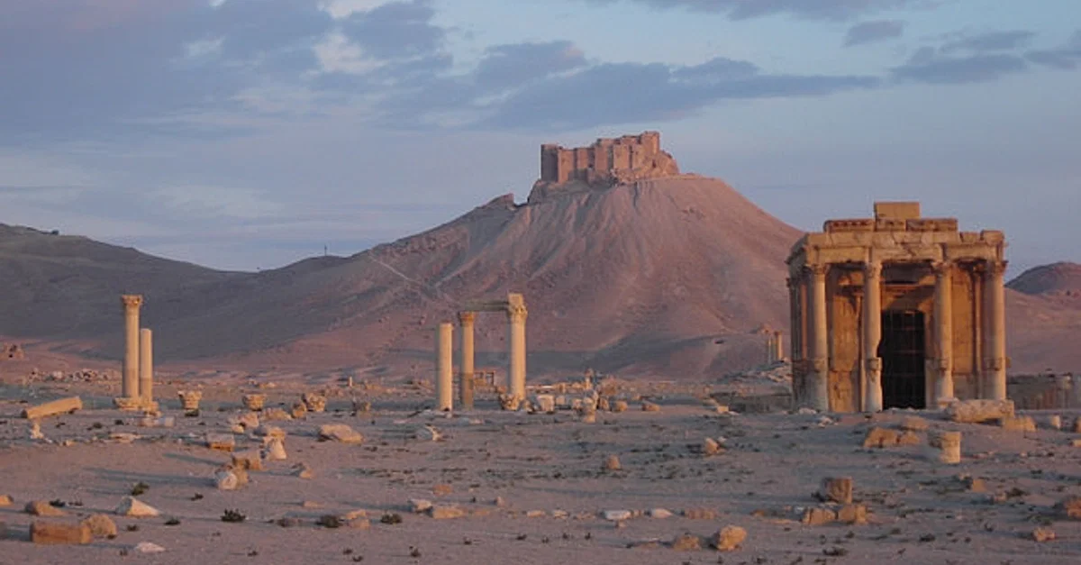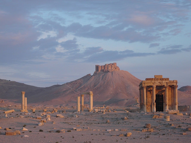 Photo of Palmyra's 13th century CE Mamluk castle with ancient ruins in the foreground.