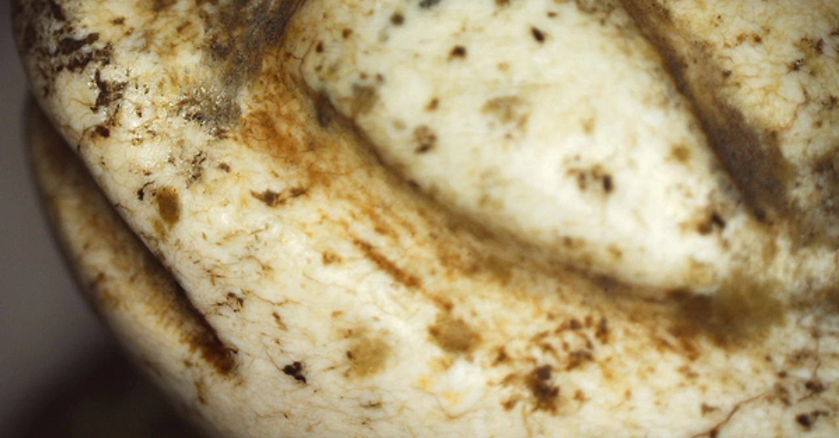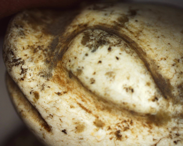 Possibly from the period of the Liangzhu Culture in China (c. 3400-2250 BCE), this dog amulet measures 63.1 x 19.9 x 20.8 mm (2.4 x 0.78 x 0.81 inches). This image highlights the details of the face. The amulet is made from tremolite-nephrite jade. Property of Mr. Alfred Correya.
