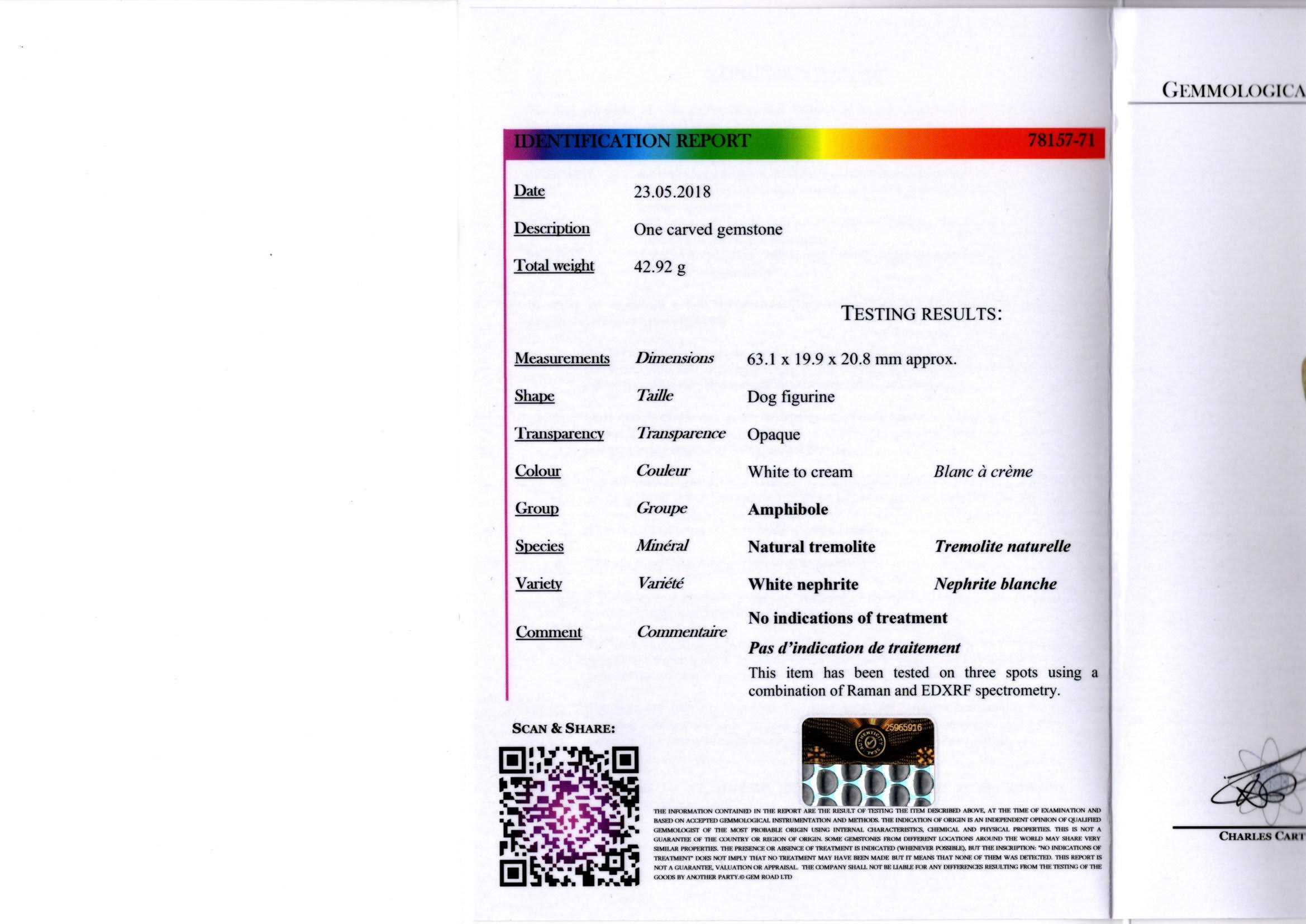 Laboratory Report by Gemmological Certification Services, London (Number 78157-71, 23 May 2018). It confirms that the Correya Dog is made from tremolite-nephrite jade.