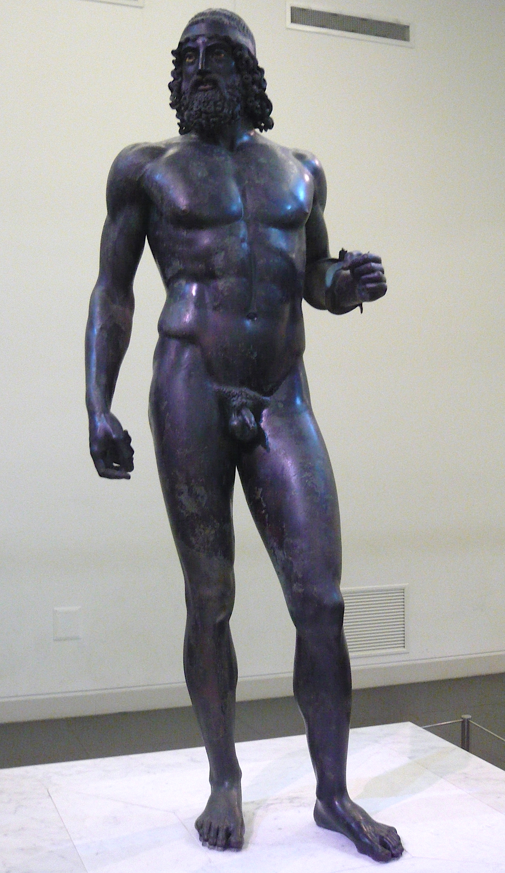 The bronze Greek sculpture known as Riace Warrior A, c. 460-450 BCE. One of a pair known as the Riace Bronzes which were rescued from the Ionian Sea near Riace Marina, Italy in 1972 CE. The bronze figure is 2.05 m (6.73 ft.) tall. (National Archaeological Museum of Reggio Calabria, Italy)