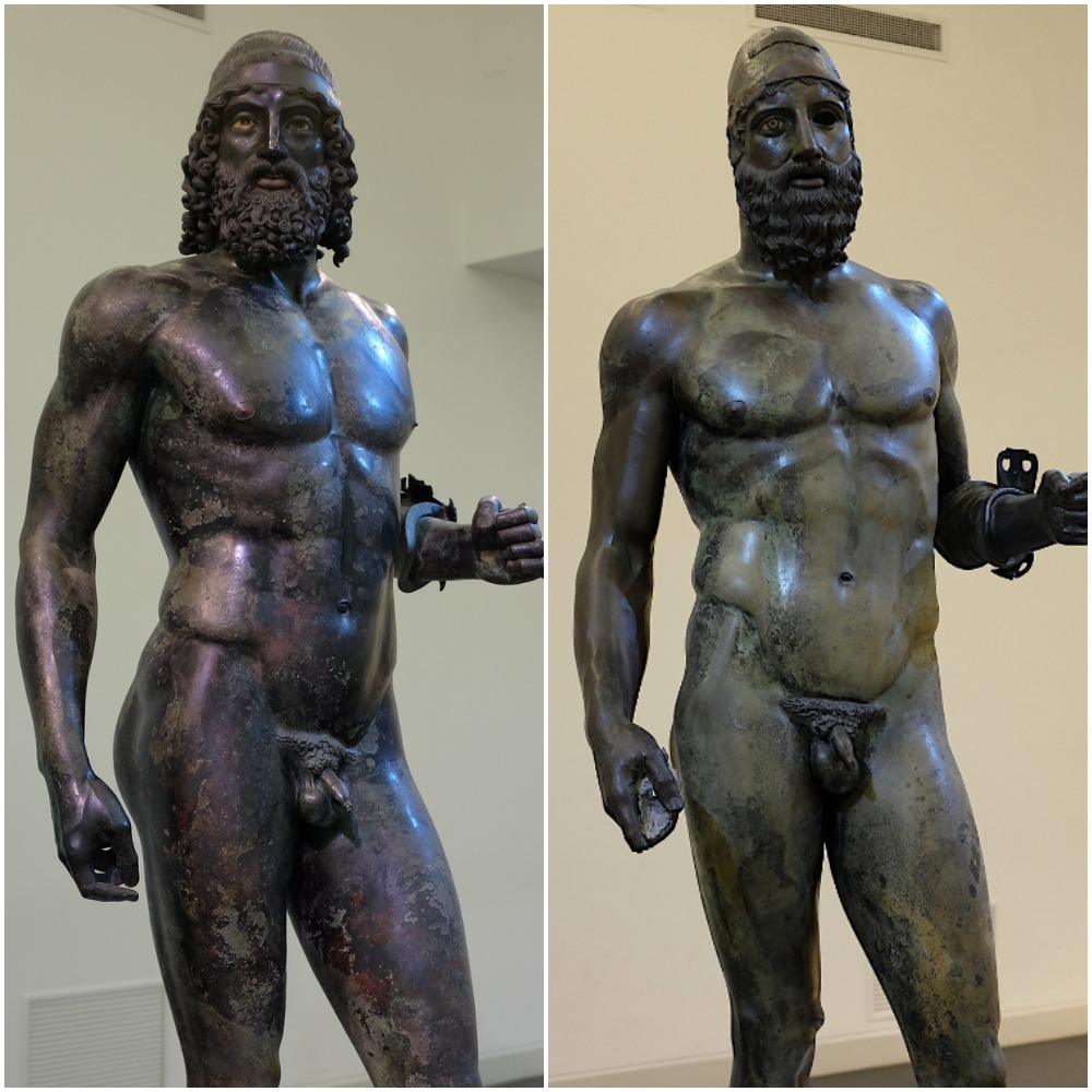 The bronze Greek sculptures known as the Riace Bronzes or the Riace Warriors, c. 460-450 BCE. The statues were rescued from the Ionian Sea near Riace Marina, Italy in 1972 CE. The bronze figures are around 2 metres tall. (National Archaeological Museum of Reggio Calabria, Italy)