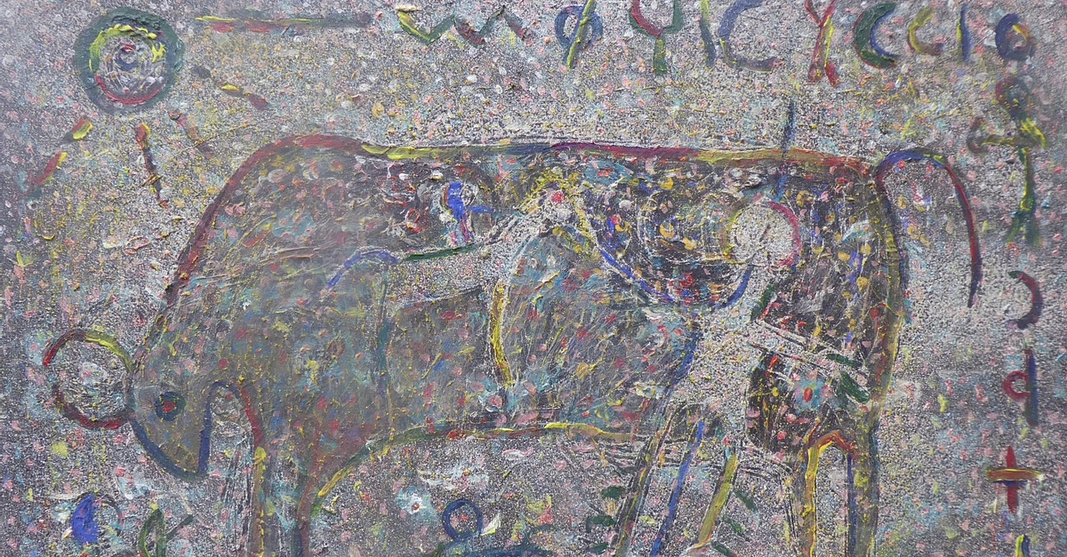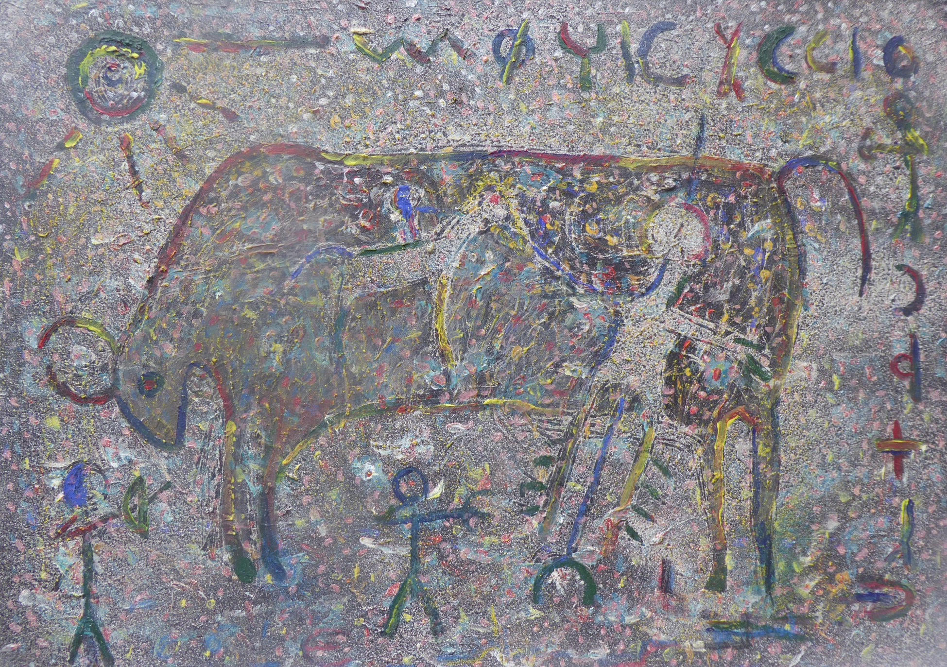 A contemporary acrylic and mixed media painting titled 'A Hunting Scene' by artist Rawan Al Adwan inspired by the 1st century BCE to 4th century CE Safaitic tribal art found on rocks in the desert of Jordan. (Used with permission)