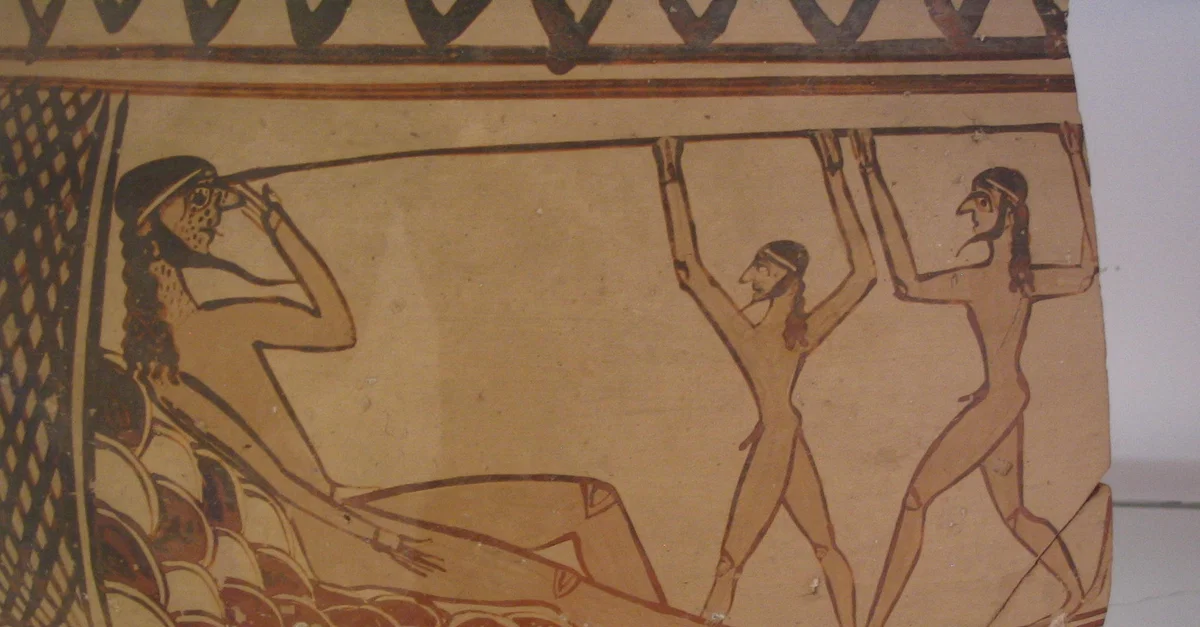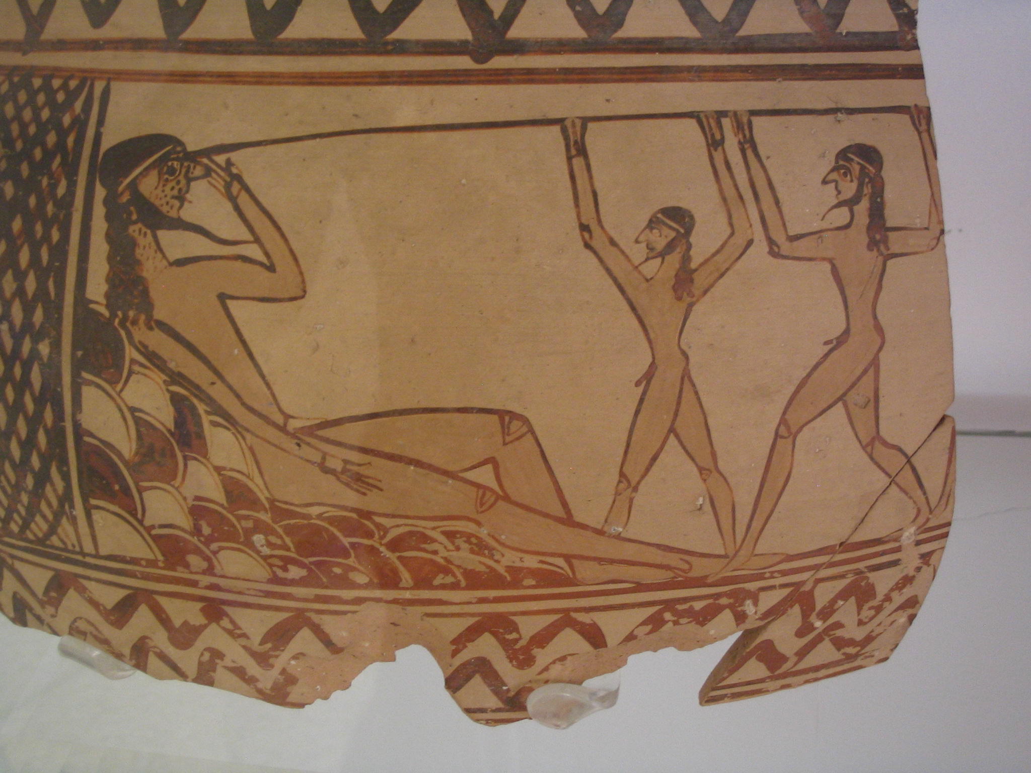 A polychrome Krater fragment (mid 7th century BCE) depicting the blinding of the Cyclops Polyphemus, one of Odysseus' many adventures on his long voyage home to Ithaka following the Trojan War. (Argos Archaeological Museum, Greece)