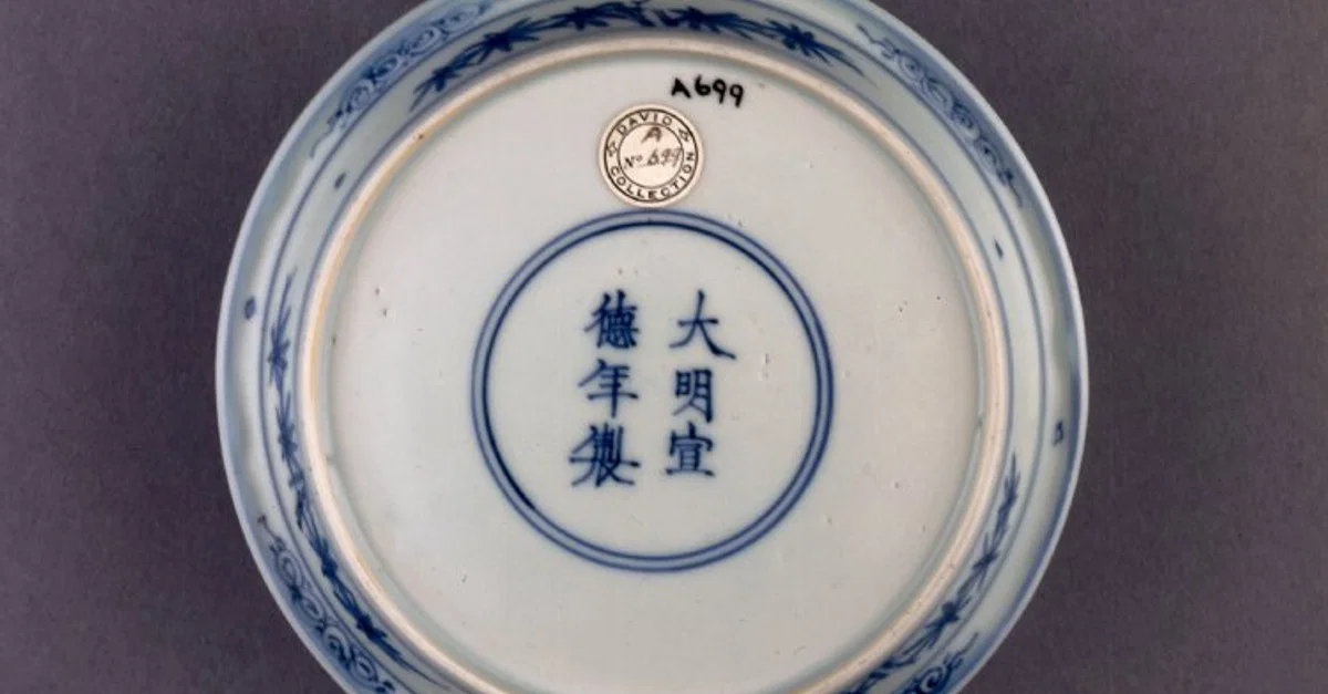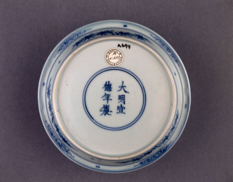 The underside of a Ming Dynasty (1368-1644 CE) blue-and-white porcelain plate showing an inscription, typical of the wares of that dynasty. The Chinese inscription reads 'Made in the Ming dynasty, Xuande reign'. 1540-1600 CE (British Museum, London)