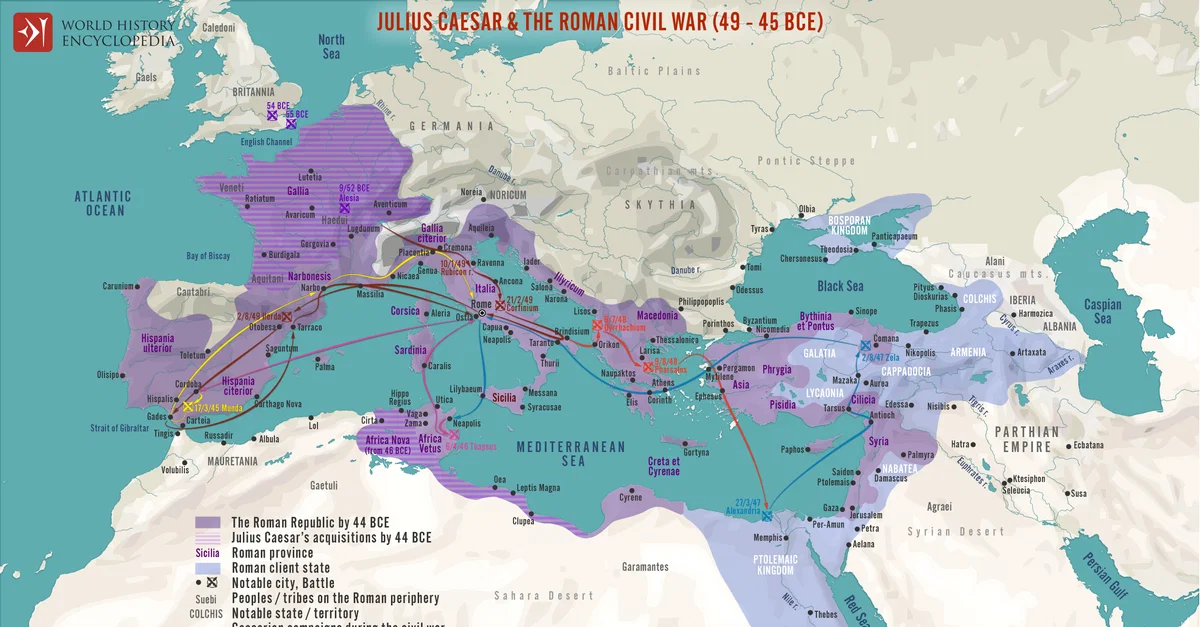 Uma tensão crescente entre Pompeu e César foi se avolumando. Pompeu tinha ciúmes do sucesso e da fama de César, enquanto César queria retornar à política. Por fim, essas diferenças os levaram à batalha e, em 48 a.C., eles se encontraram em Farsália. Pompeu foi derrotado e fugiu para o Egito, onde foi morto por Ptolomeu XIII. César cumpriu seu destino garantindo as províncias orientais e o norte da África; retornou a Roma como um herói e foi declarado ditador vitalício. Muitos de seus inimigos, bem como vários aliados, viram sua nova posição como uma séria ameaça aos fundamentos da República e, apesar de várias reformas populares, seu assassinato nos Idos de março de 44 a.C. prosternou a República. Seu herdeiro e filho adotivo Otávio derrotou Marco Antônio, tornando-se Augusto, o primeiro imperador de Roma. A República se fora e de suas cinzas ergueu-se o Império Romano.