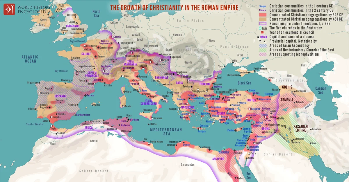 تعد نشأة المسيحية وانتصارها النهائي في أوروبا العصور الوسطى موضوعًا رئيسيًا يهم المؤرخين حاليًا، فكانت وجهة النظر التقليدية هي أن المسيحية تقدم نظامًا أخلاقيًا وعزاءً لعالم محروم روحياً، ومن الواضح أن هذا ليس صحيحاً، حيث كان القدماء أتقياء ومستيقظين روحياً مثل المسيحيين، استوعبت المسيحية هذه الثقافة ولكنها أضافت ابتكارات فريدة وقدمت معني جديدًا، وفي عالم لا يوجد فيه يقين بشأن الحياة الآخرة، قدمت المسيحية ضمانًا لدخول الشخص الجنة، فعندما تحول "قسطنطين الكبير"، كم من الناس رأوا أن رياح التغيير السياسي هي وسيلة عملية للبقاء على قيد الحياة والمضي قدمًا؟
