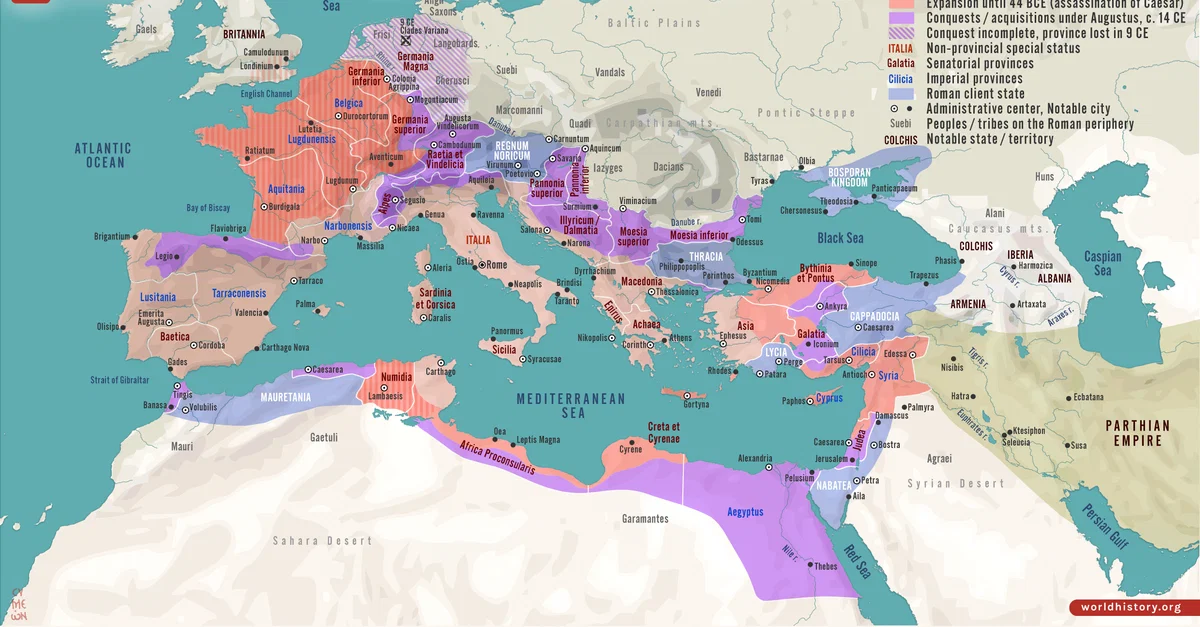 Η Ρωμαϊκή Αυτοκρατορία, στο απόγειό της (περ. 117 μ.Χ.), ήταν η πιο εκτεταμένη πολιτική και κοινωνική δομή του δυτικού πολιτισμού. Χτίζοντας πάνω στα θεμέλια που είχε θέσει η Ρωμαϊκή Δημοκρατία, η αυτοκρατορία έγινε η μεγαλύτερη και ισχυρότερη πολιτική και στρατιωτική οντότητα στον κόσμο μέχρι την εποχή της και επεκτάθηκε σταθερά μέχρι την πτώση της, στη Δύση, το 476 μ.Χ.
