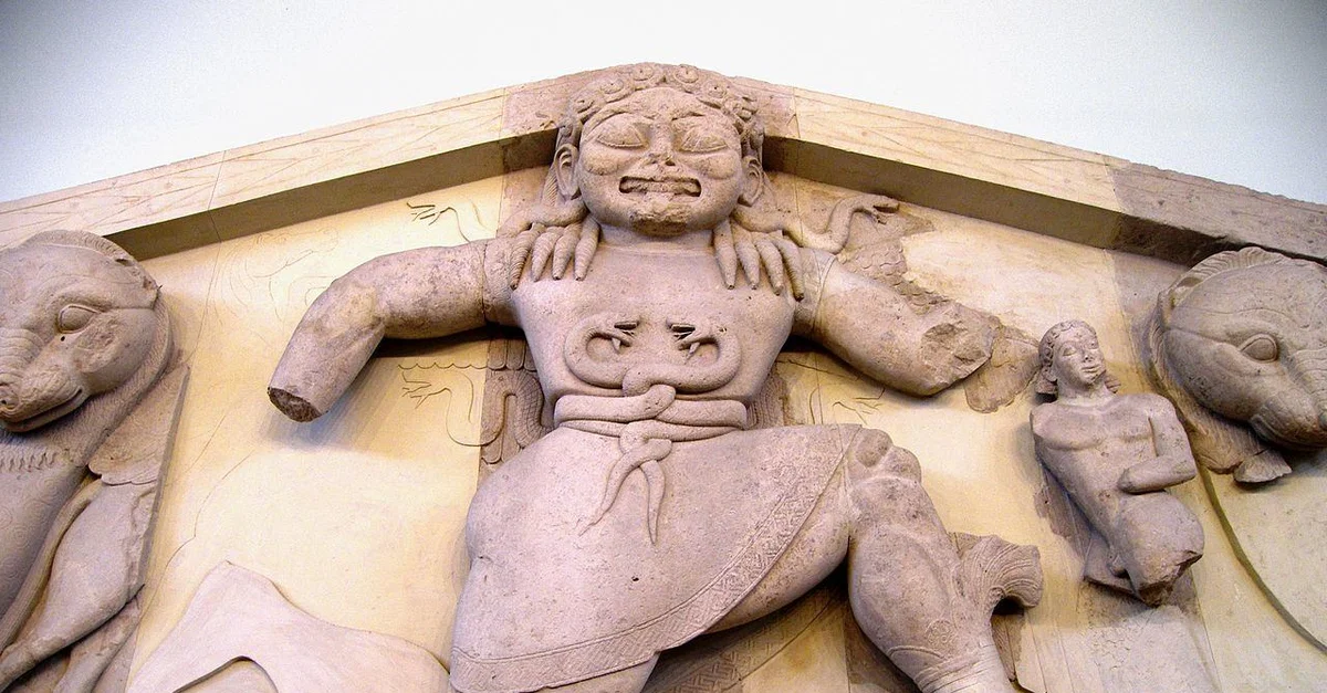 El famoso templo dórico de Artemisa, que data de alrededor de 585 a.C., en origen tenía 8 × 17 columnas exteriores y una cella de 3 naves, pronaos y opistódomos con tejas de arcilla, sustituidas por mármol en 535-525 a.C. Es el templo más antiguo de Grecia en incorporar esculturas importantes en piedra. Todavía se conservan grandes secciones del frontón occidental, que representan a la gorgona mitológica Medusa flanqueada por panteras, lo que ilustra su papel como Potnia Theron, señora de los animales, un epíteto normalmente atribuido a Artemisa. También están representados los hijos de Medusa: Crisaor (Espada dorada) y el caballo alado Pegaso, que a menudo aparecía también en las monedas de la antigua Córcira. Entre los demás restos arqueológicos encontrados en Corfú hay partes de las antiguas murallas de la ciudad y del periodo romano quedan astilleros, instalaciones portuarias, talleres y un ágora pavimentada.