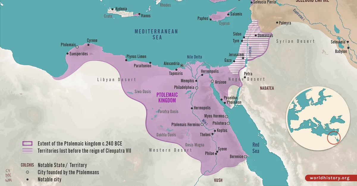 La capacidad militar del Egipto ptolemaico disminuyó a finales del siglo II a.C. y pasó a depender cada vez más del apoyo romano. Ptolomeo XII y su hija Cleopatra VII dependían del ejército romano para permanecer en el poder. La relación de Cleopatra con el triunviro romano Marco Antonio le permitió expandir la influencia ptolemaica por todo el Mediterráneo oriental. Sin embargo, también precipitó una guerra entre el Senado romano y Antonio, que vio a las fuerzas de Antonio y Cleopatra destruidas por Augusto en la batalla de Accio en el año 30 a.C.