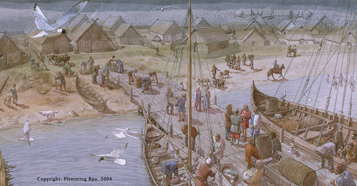 Entre los objetos descubiertos en Kaupang hay vino alemán en cerámica de Renania (completa con cuernos de vidrio para beber), miel de los wendos (eslavos), piedras de afilar de otros lugares de Noruega, cerámica danesa, ropas francas o frisias, así como atriles anglosajones y joyería irlandesa. Los fragmentos de esteatita y los colmillos de morsa encontrados son pruebas de que Kaupang también tenía conexiones con rutas comerciales vikingas más septentrionales que se extendían hasta las regiones remotas del Ártico. Se han encontrado varias monedas extranjeras (anglosajonas, francas, danesas, árabes y del norte de África y de Asia Central), lo que demuestra la interconexión que existía entre Kaupang y otros enclaves vikingos.