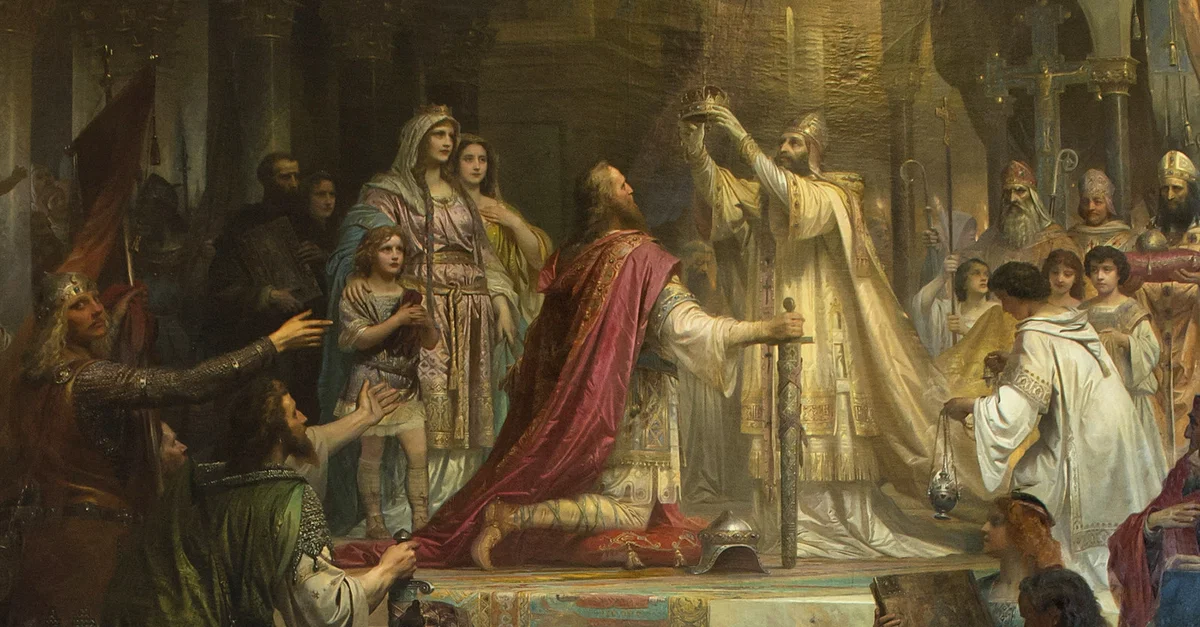 Carlomagno acordó una alianza con el papa León III (que sirvió de 795 a 816), quien buscaba protección de sus adversarios locales y de las amenazas extranjeras a la autoridad de la Iglesia. El 25 de diciembre de 800, el papa coronó a Carlomagno como emperador romano. Aunque la coronación fue un intento del papa de revivir el Imperio romano con supervisión papal, el título era puramente honorífico y, en cambio, establecía la base de un nuevo Imperio carolingio (800-887), así como de sus sucesores, el Sacro Imperio Romano Germánico. Sin embargo, las consecuencias inmediatas fueron más concretas: el título romano de Carlomagno le brindaba un reclamo legítimo a los reinos lombardo e italiano.